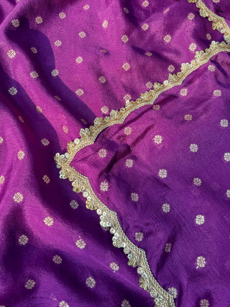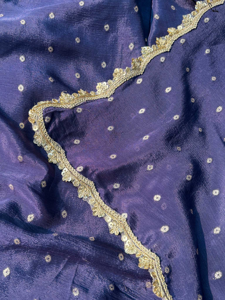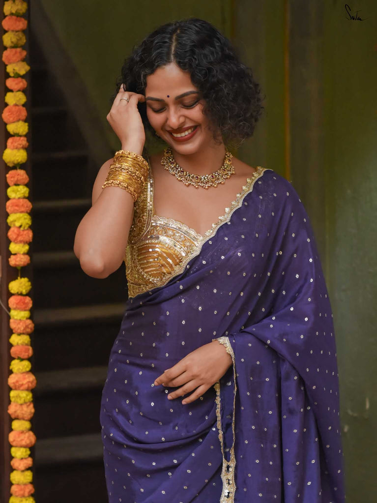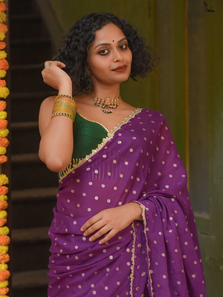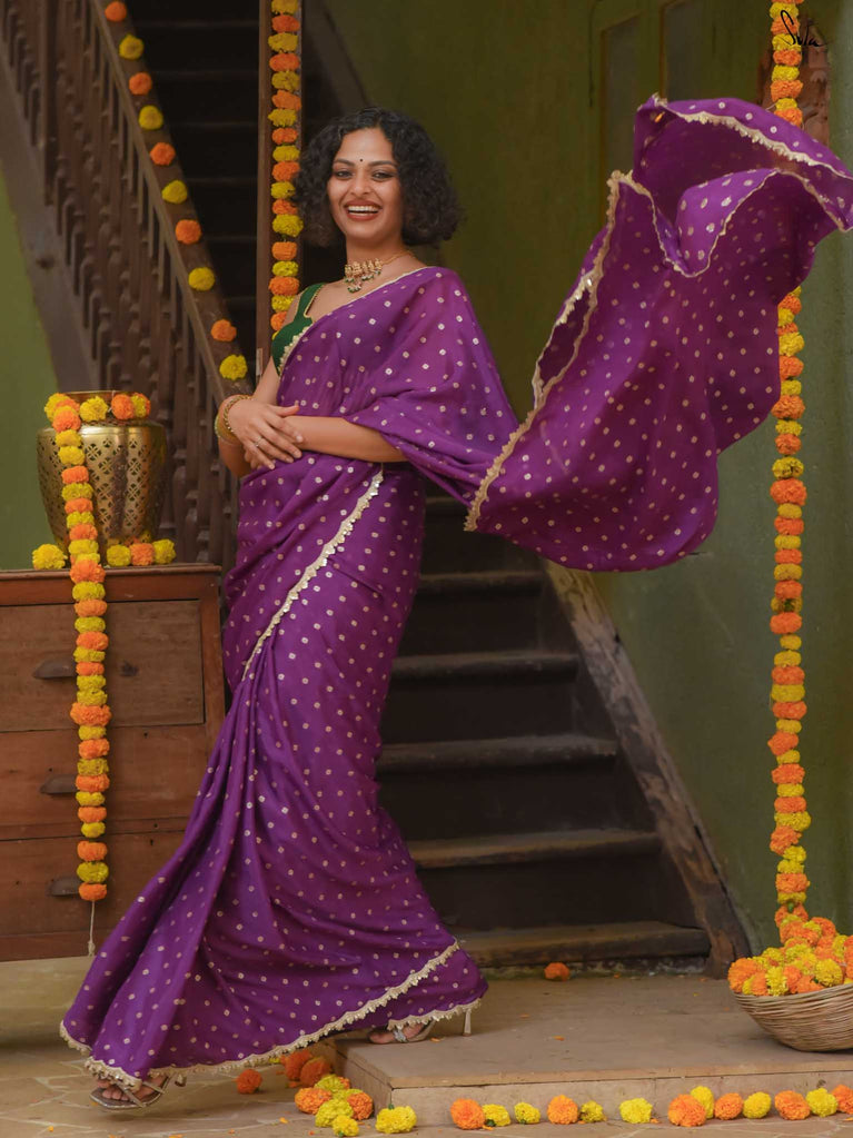 Rich & striking - this purple viscose-blend saree brings depth and elegance to every celebration. The smooth drape is adorned with light gold woven buttis that add a soft, luminous sparkle. Finished with an embroidered scallop lace, it carries a refined yet celebratory feel, perfect for evening weddings, receptions, and special family events.
