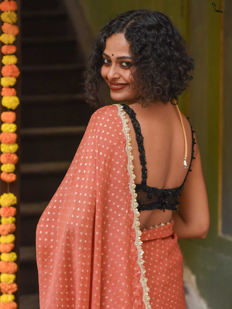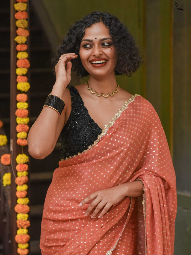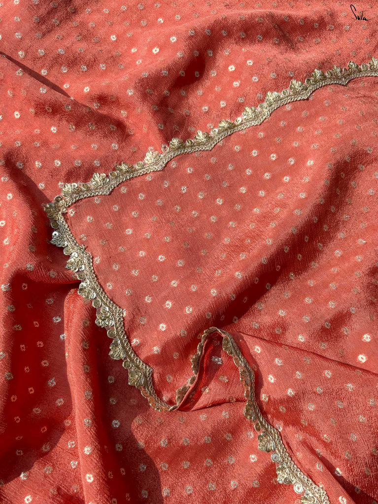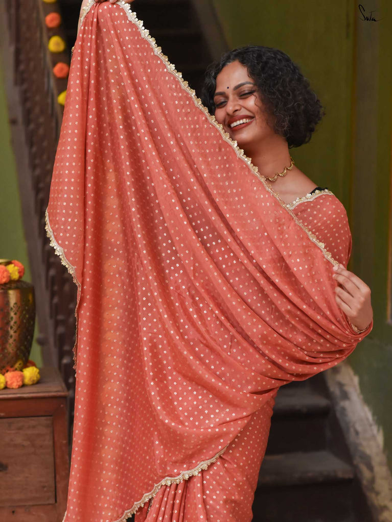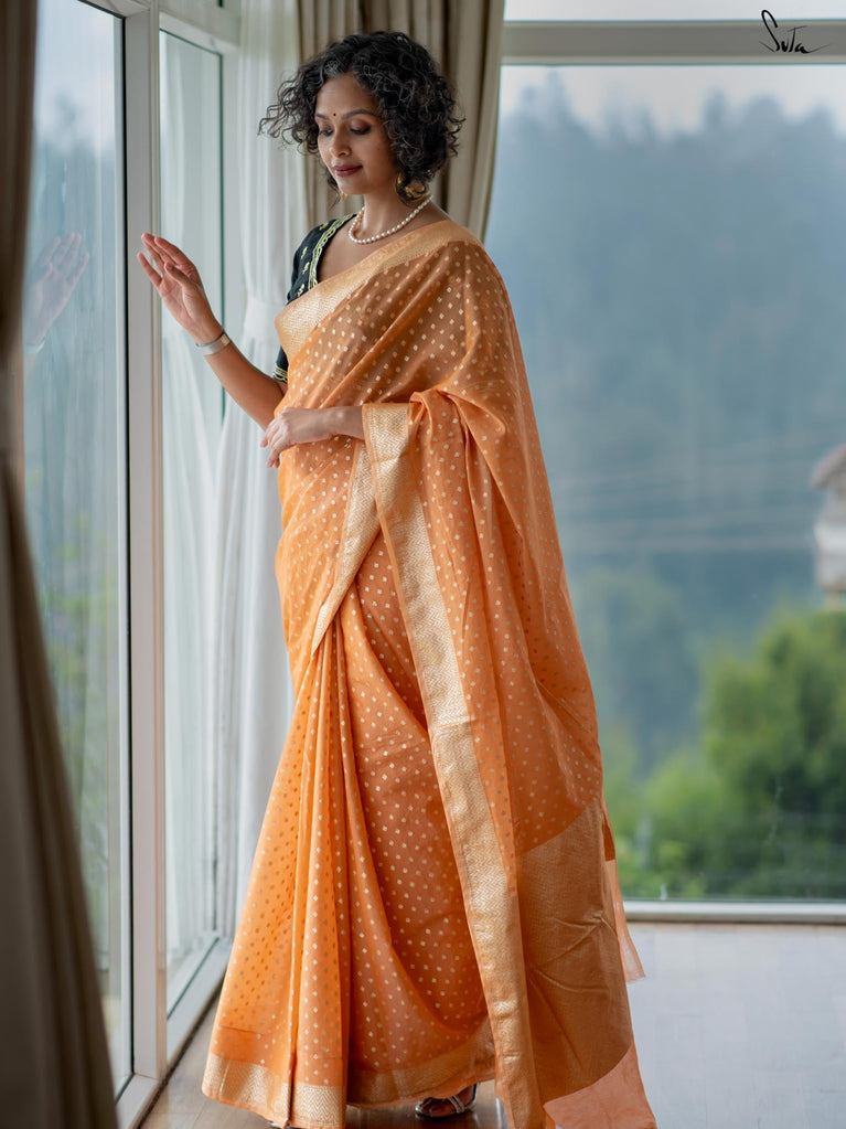Soft, soothing, and effortlessly elegant - this peach viscose-blend saree is made for those who love understated festive charm. The fluid drape is detailed with light gold woven buttis that catch the light in a subtle, refined way. The embroidered scallop lace along the edges adds a graceful finish, making this saree perfect for intimate weddings, pre-wedding dinners, and evening celebrations.