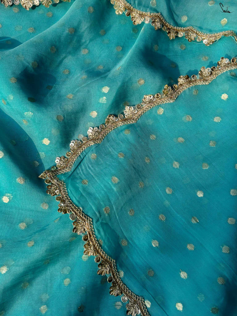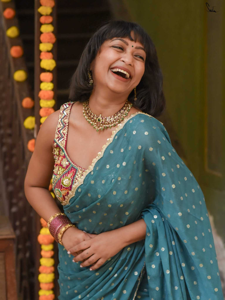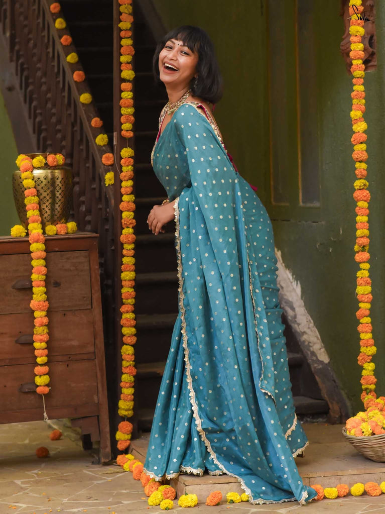 Striking, graceful, and full of charm - this teal viscose-blend saree is designed to stand out beautifully in any celebration. The soft, fluid drape is adorned with light gold woven buttis, adding a subtle shimmer that plays gently with movement. Finished with an embroidered scallop lace, it carries an elegant touch perfect for weddings, sangeet evenings, and joyful family gatherings.