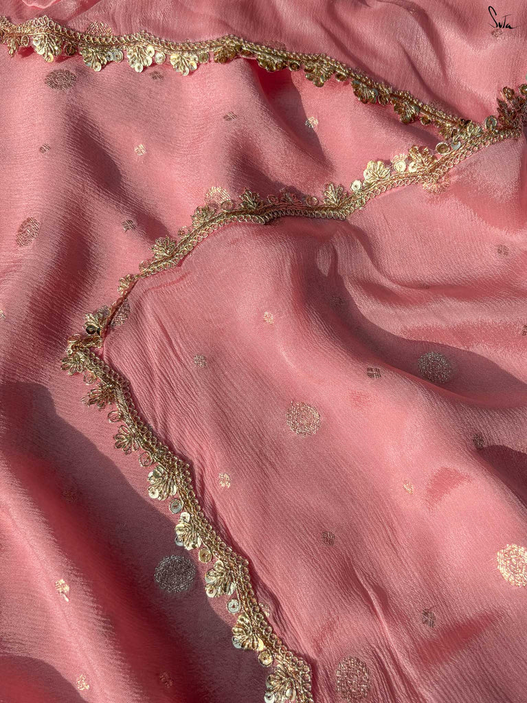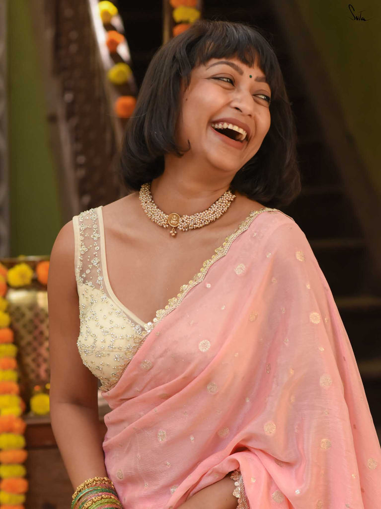 Soft & graceful - this baby pink viscose-blend saree brings a gentle elegance to every occasion. The smooth drape is sprinkled with light gold woven buttis, adding a subtle glow that enhances its pastel charm. Finished with an embroidered scallop lace, it offers a delicate, refined look perfect for daytime weddings, pre-wedding rituals, and intimate celebrations.