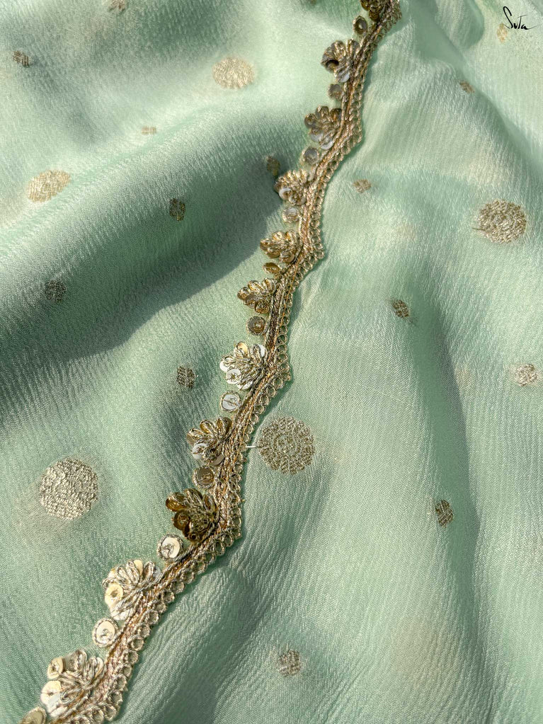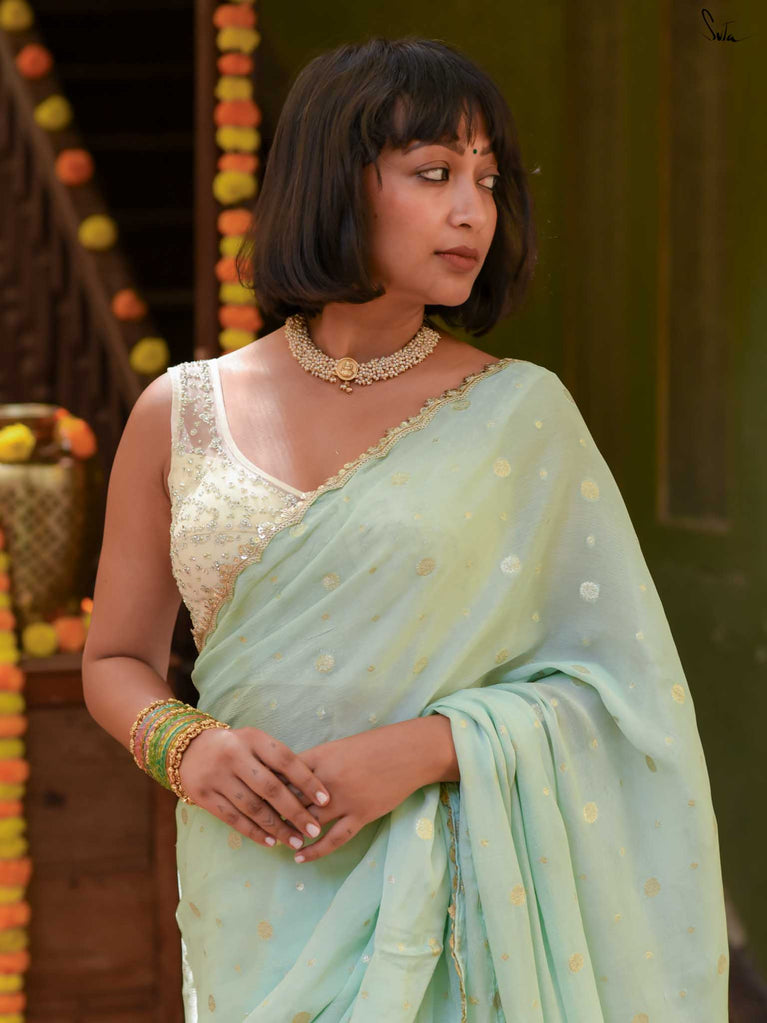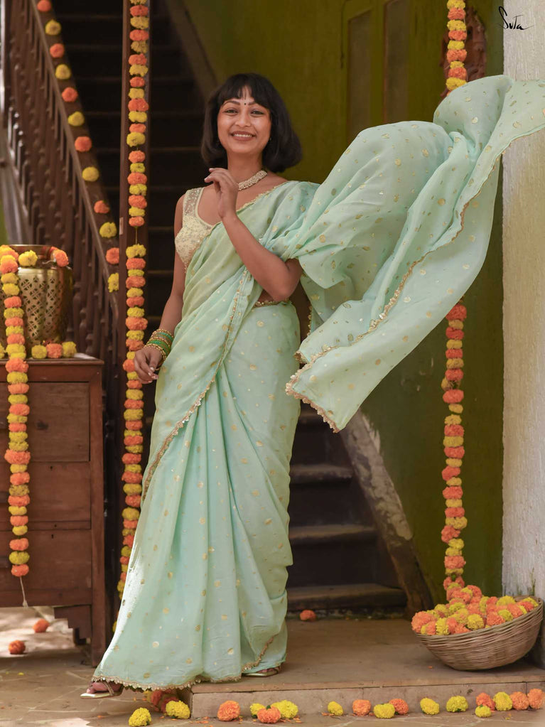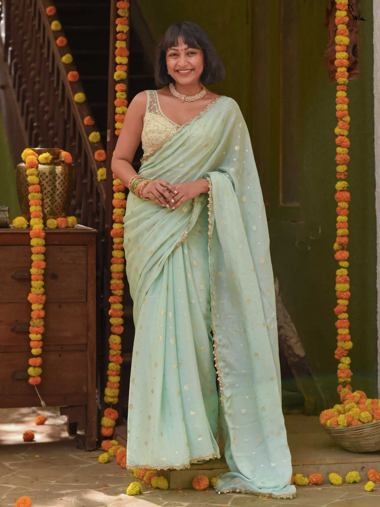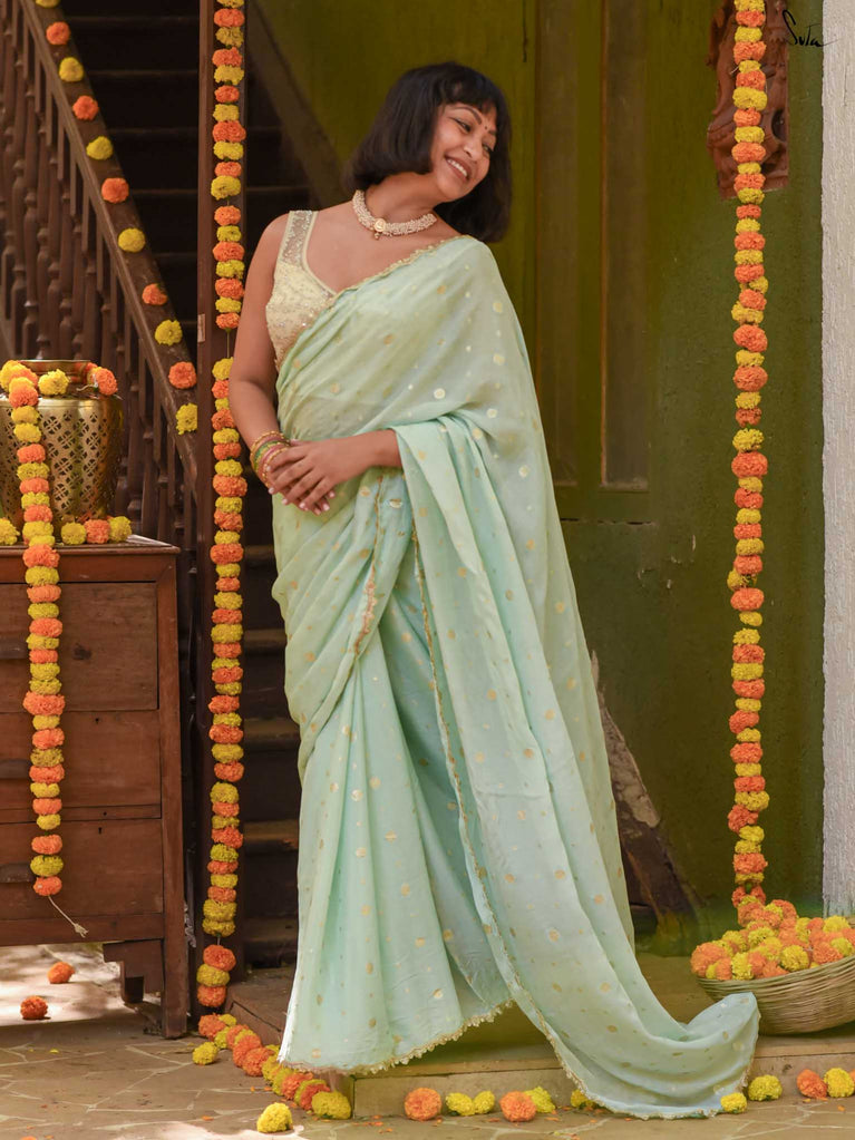 Fresh, calm, and radiant - this mint green viscose-blend saree brings a cool elegance to the shaadi season. The fluid drape is accented with light gold woven buttis, adding a soft, luminous sparkle as you move. The embroidered scallop lace frames the saree with a delicate finish, making it perfect for daytime weddings, mehendi functions, and intimate celebrations.