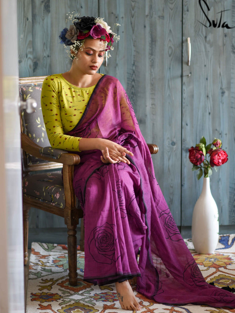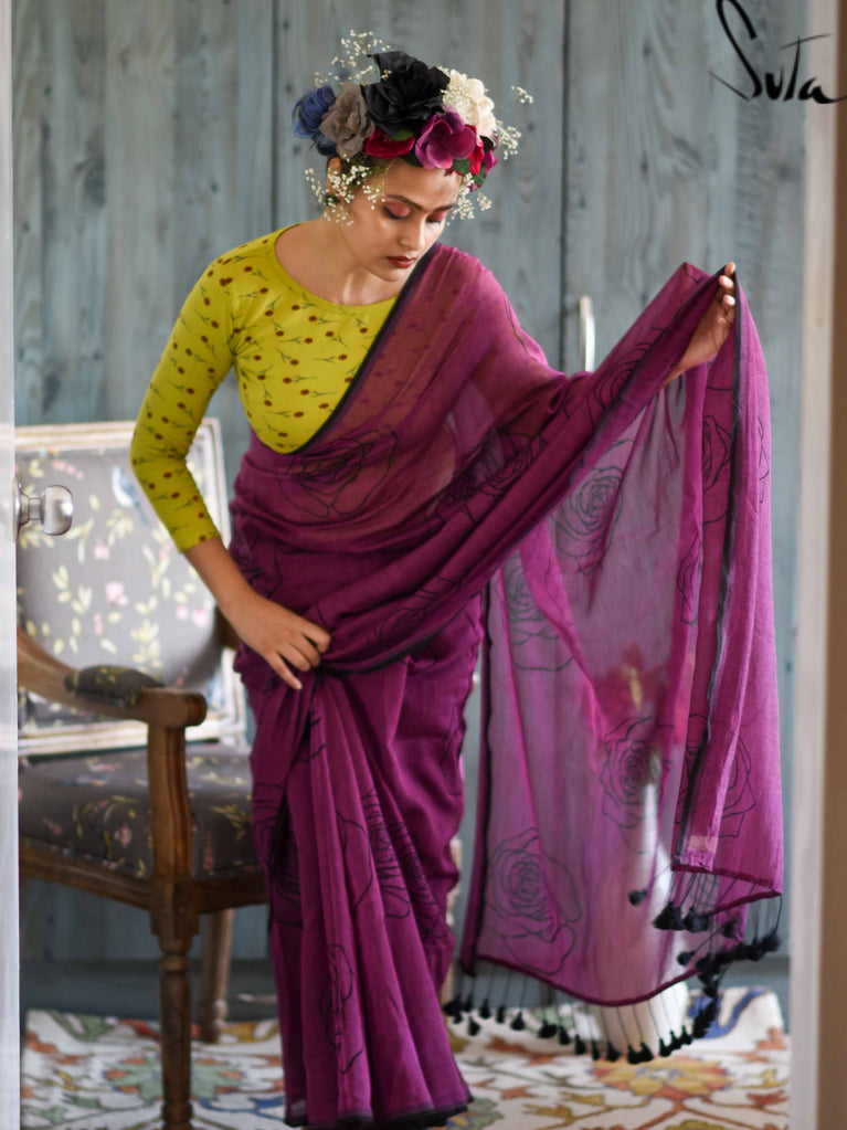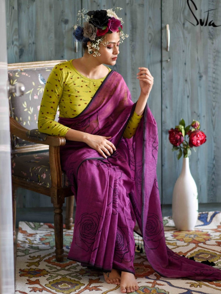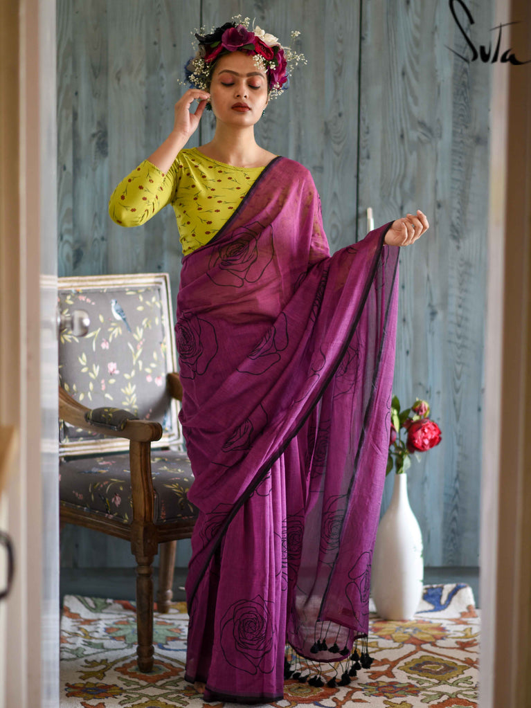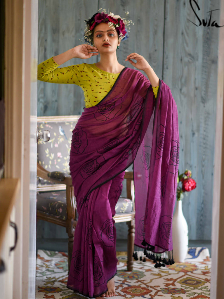 This purple made-in-heaven mul saree with the prettiest screenprinted design is a stunner!
