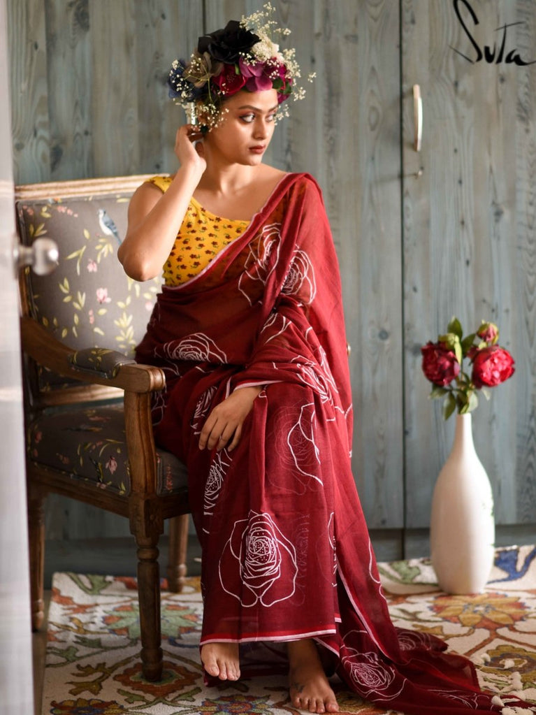 This maroon made-in-heaven mul saree with screenprinted design is simply dreamy!