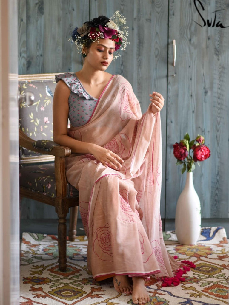 This brown made-in-heaven mul saree in screen printed design is all heart!