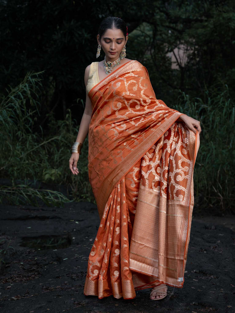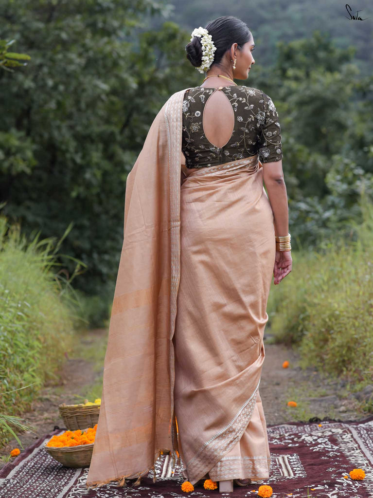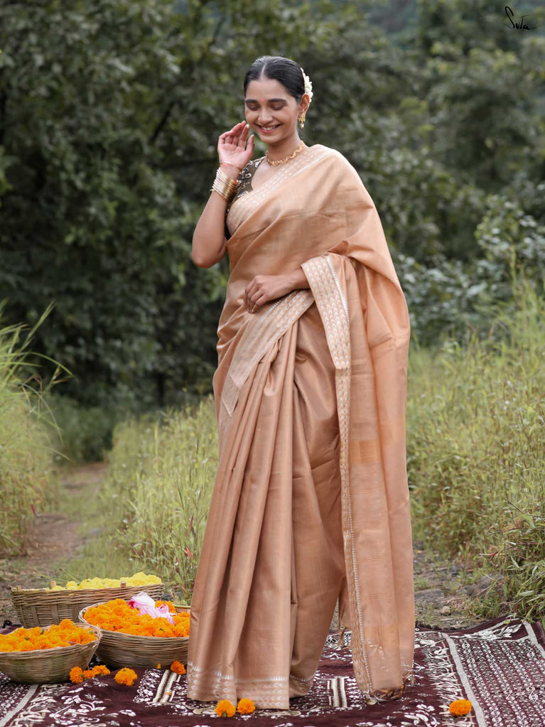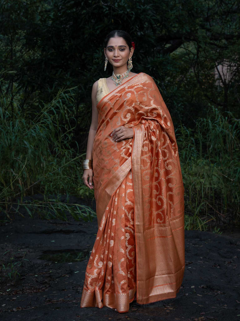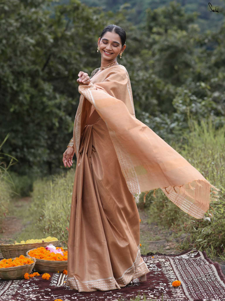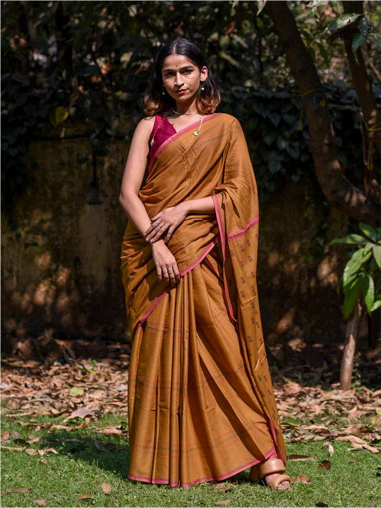 Warm as the first sun after winter, Chaiti captures the soul of celebration in its rust-toned weave. Crafted in airy cotton-silk, it features a dull gold floral jaal that glows softly - never loud, always luminous. Lightweight, elegant, and full of heart, this saree is made for those golden-hour moments that linger long after they’re gone.