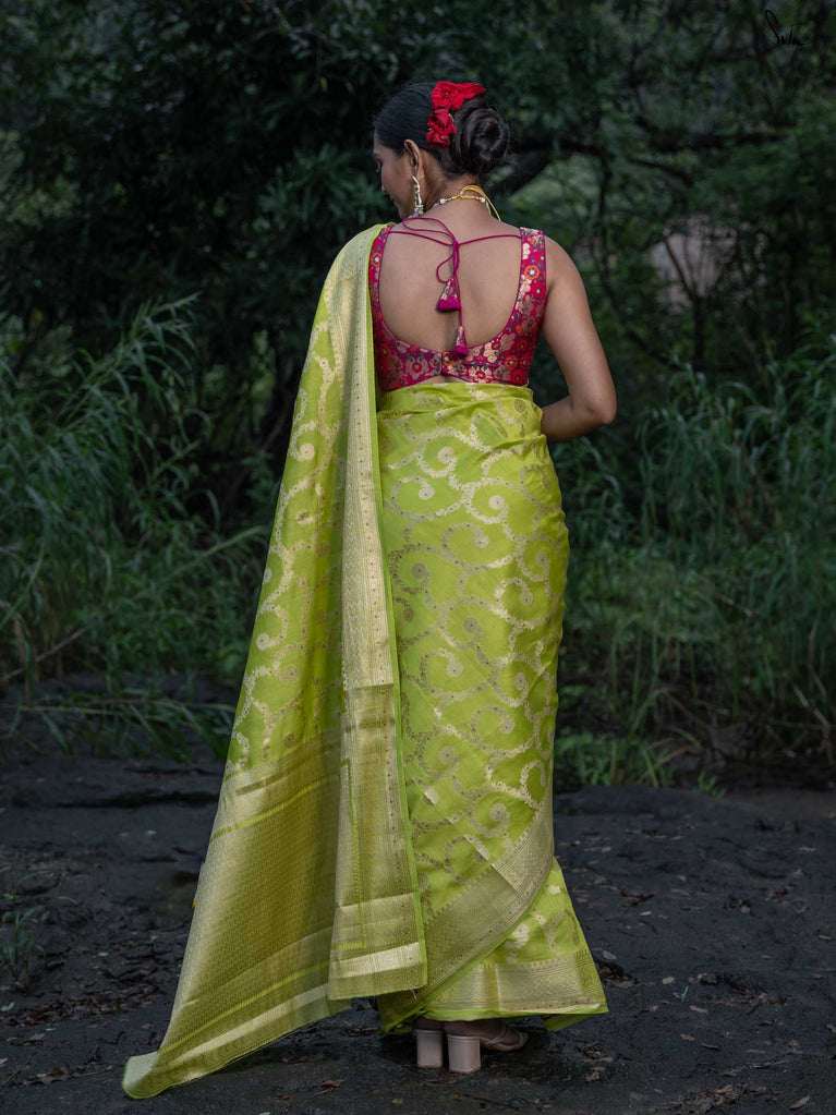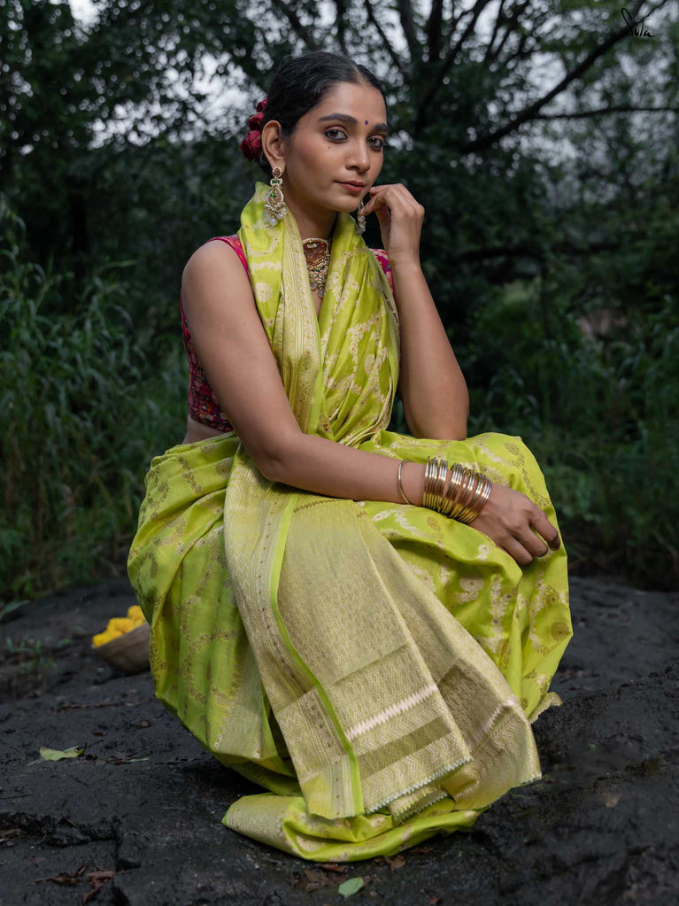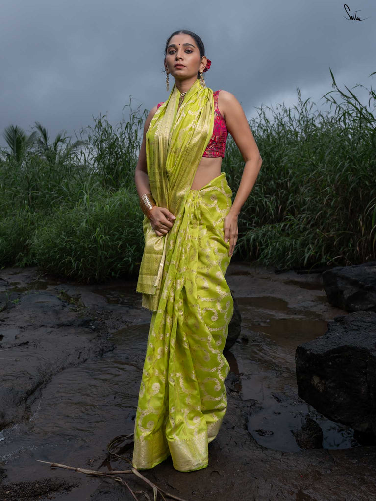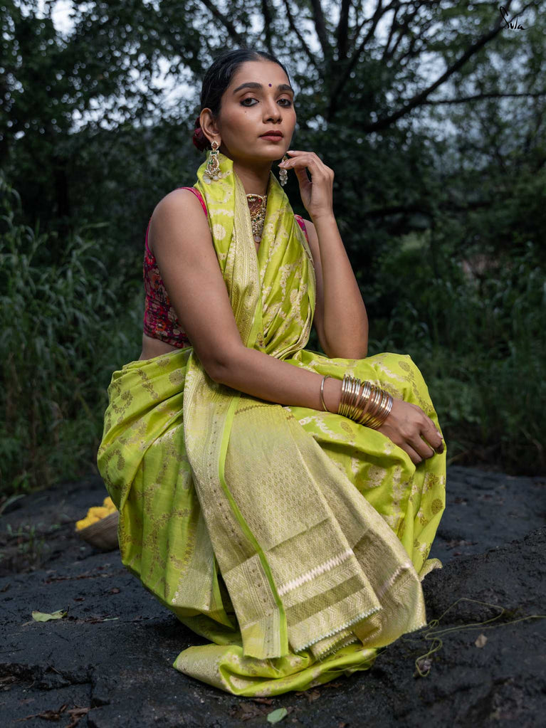 Vibrant, fearless, and full of joy - Swarangi is a celebration in motion. Woven in striking neon green cotton-silk, it’s brought to life with a soft dull gold floral jaal that adds just the right touch of elegance. Light, playful, and unapologetically bright - this saree is made to turn ordinary days into festive memories.
