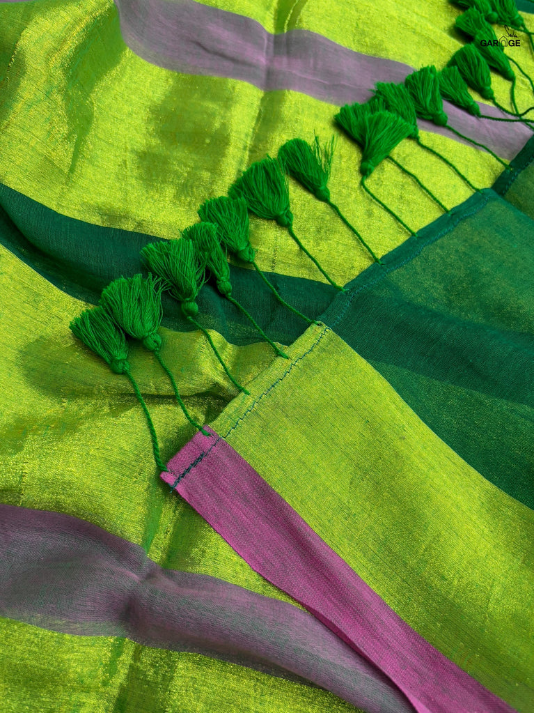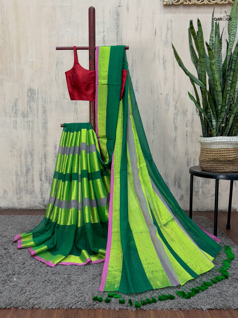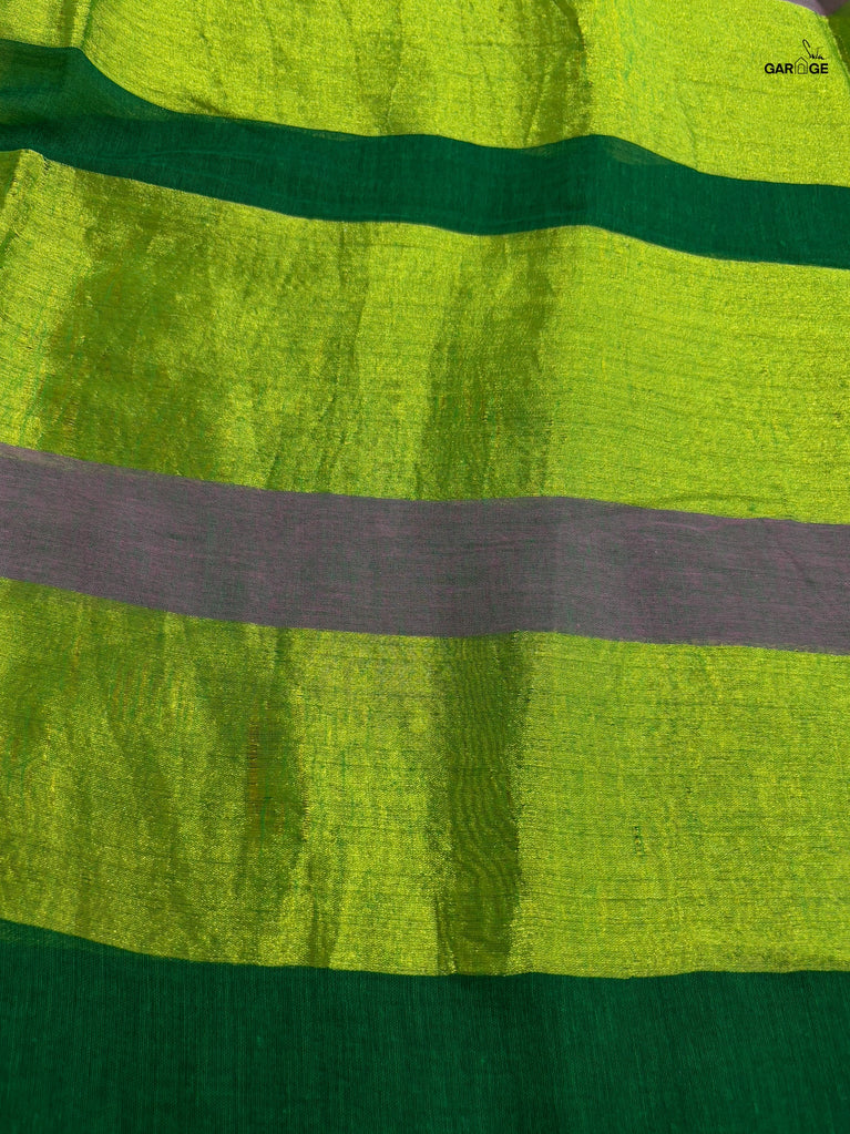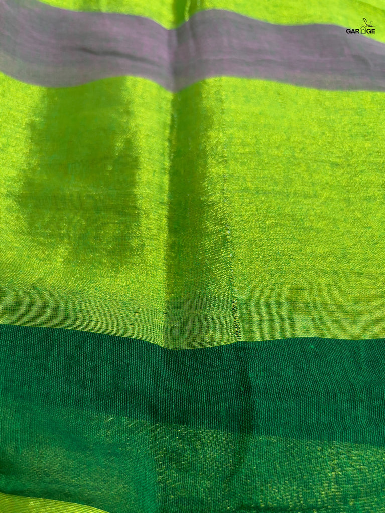 Vibrant, fearless, and full of joy - Swarangi is a celebration in motion. Woven in striking neon green cotton-silk, it’s brought to life with a soft dull gold floral jaal that adds just the right touch of elegance. Light, playful, and unapologetically bright - this saree is made to turn ordinary days into festive memories.