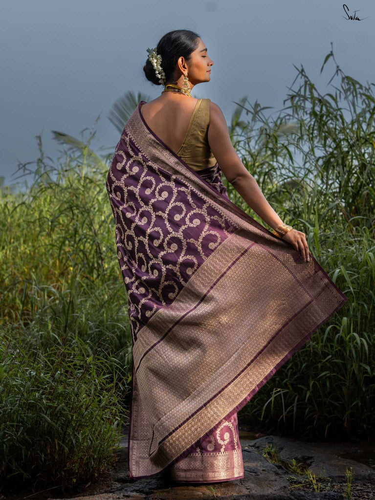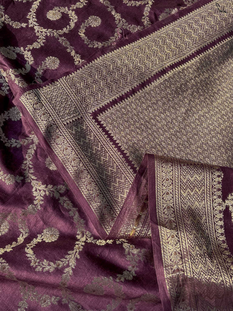 Like the melody it’s named after, Thumri flows with quiet grace and deep emotion. Draped in a rich wine hue, this cotton-silk saree carries an intricate floral jaal woven in soft, dull gold - a gentle nod to timeless opulence. Light as a whisper yet regal in presence, it’s perfect for moments that call for understated celebration.