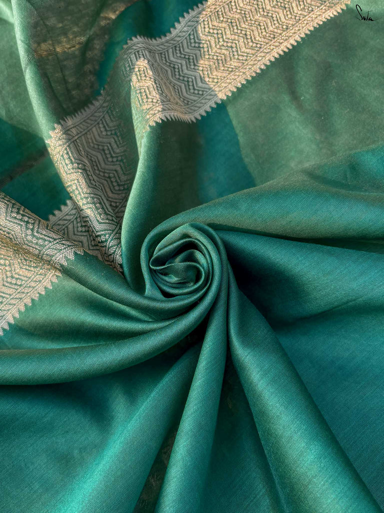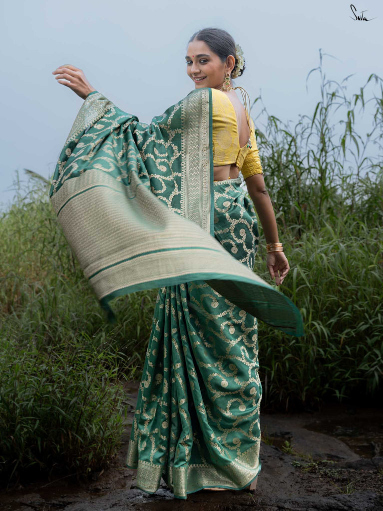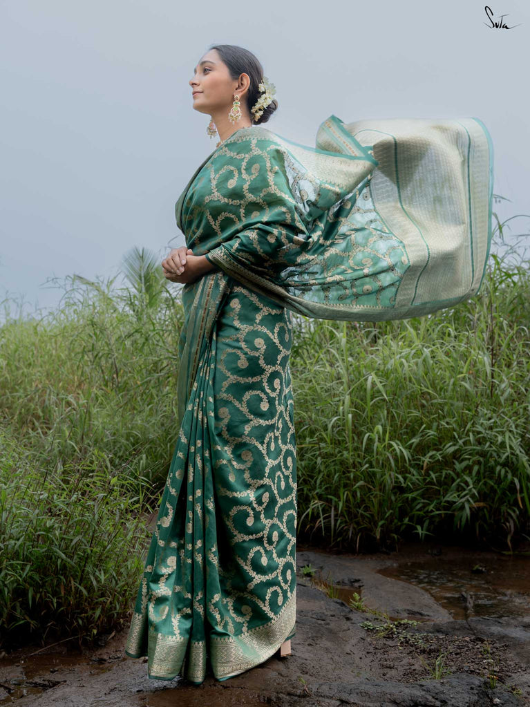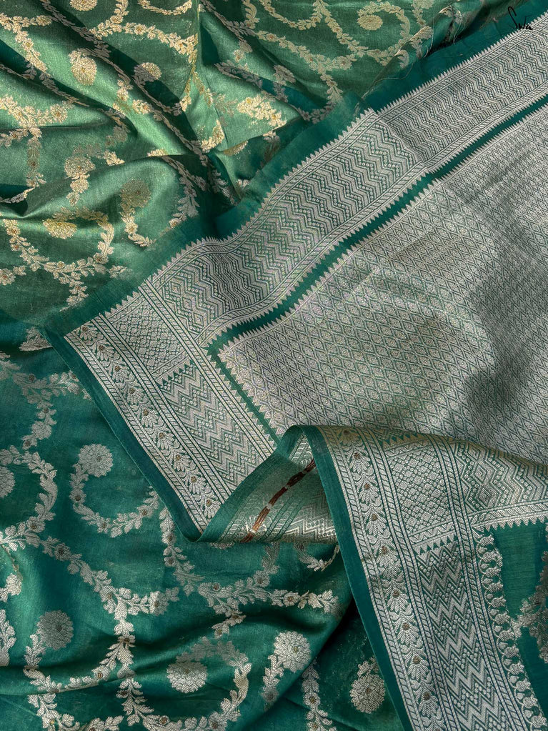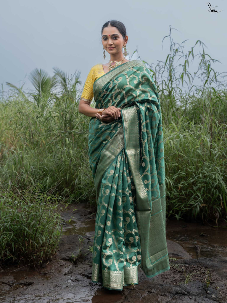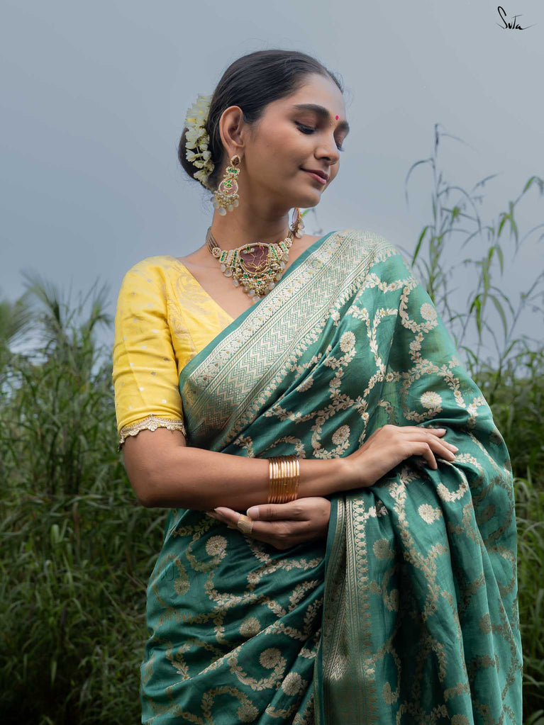Bold yet beautifully balanced, Tivra mirrors the deep rhythm of nature. Its dark green cotton-silk base is brought to life with a delicate dull gold floral jaal - a dance of light and depth. Featherlight to drape yet rich in detail, this saree brings quiet sophistication to every festive moment.