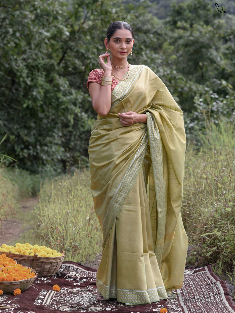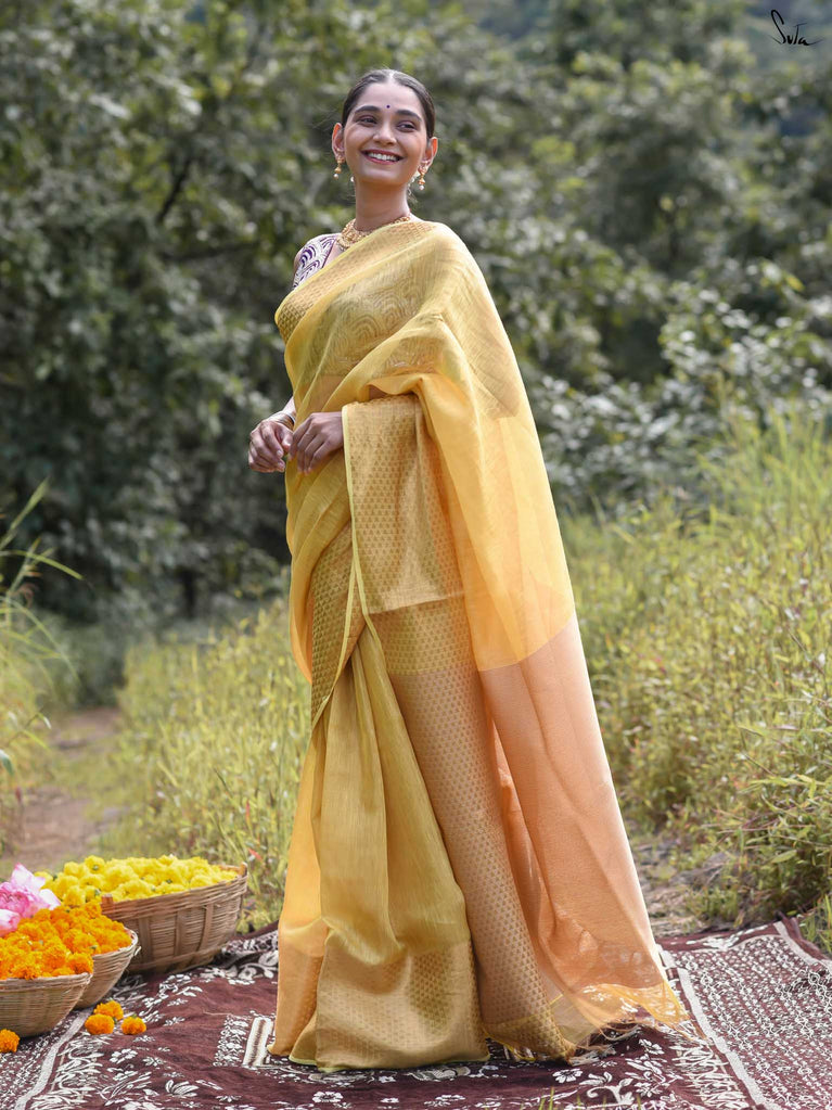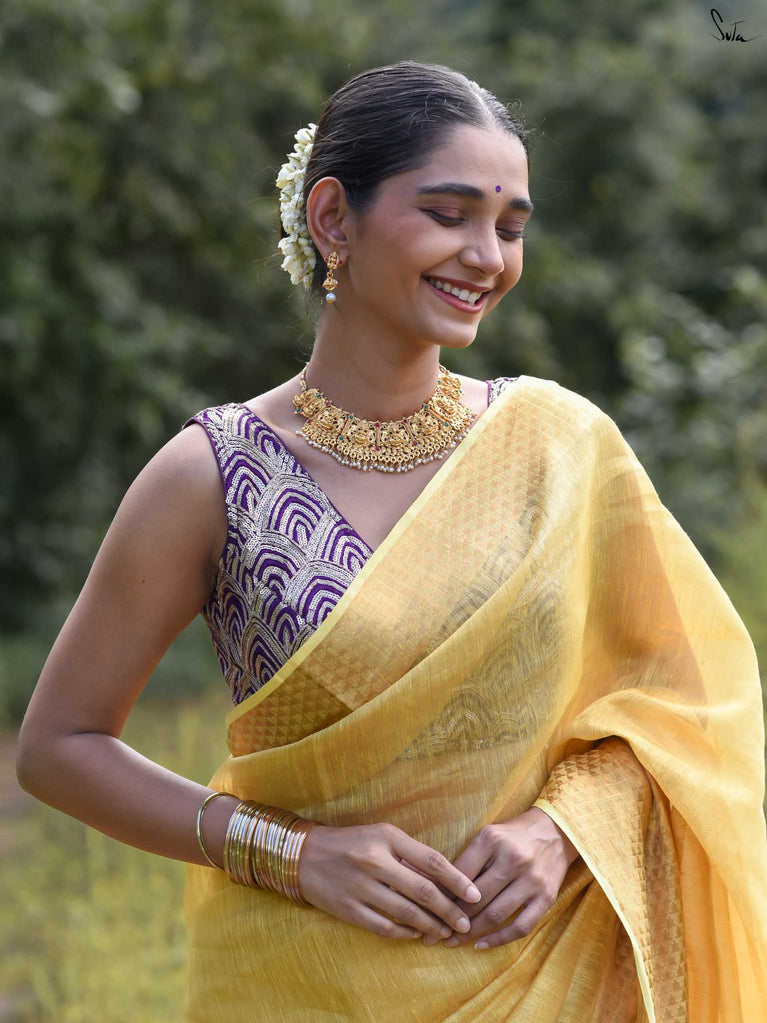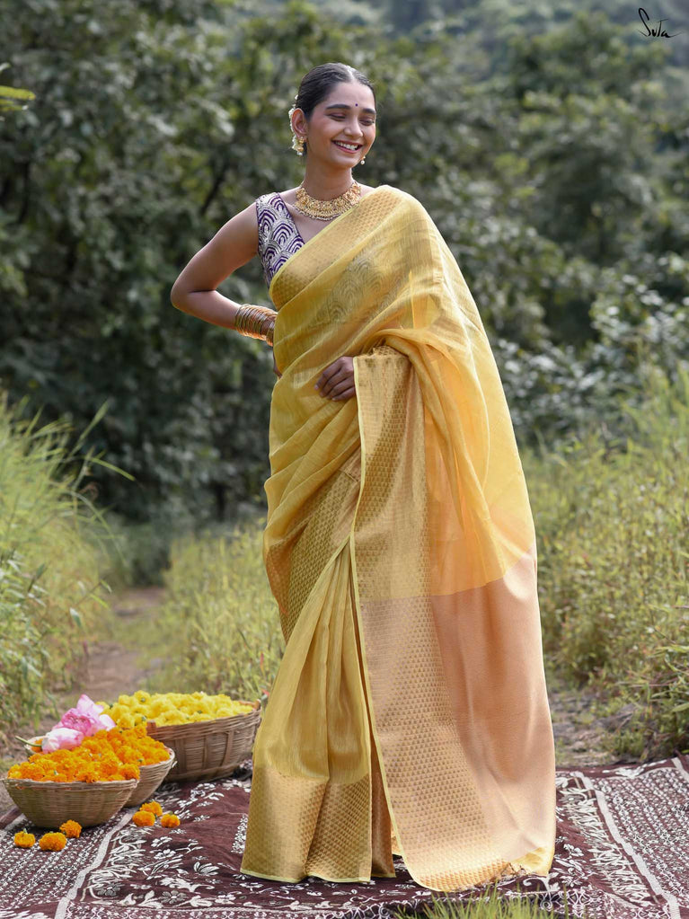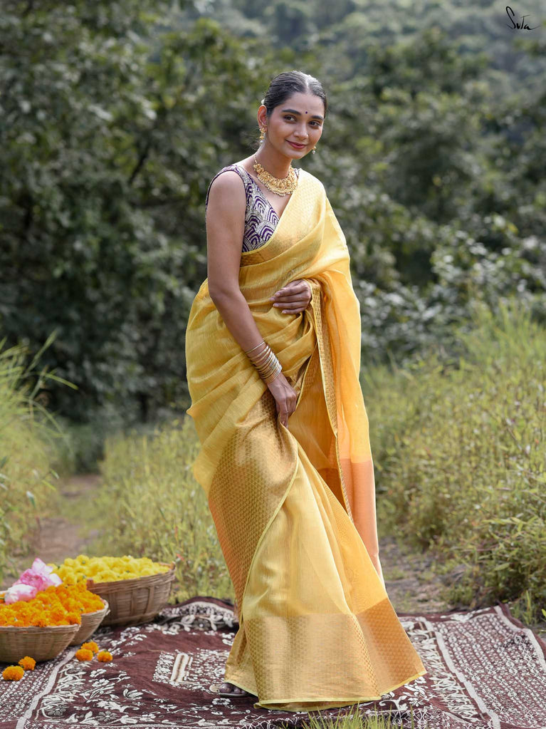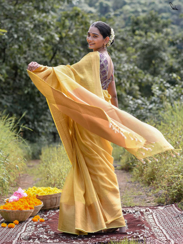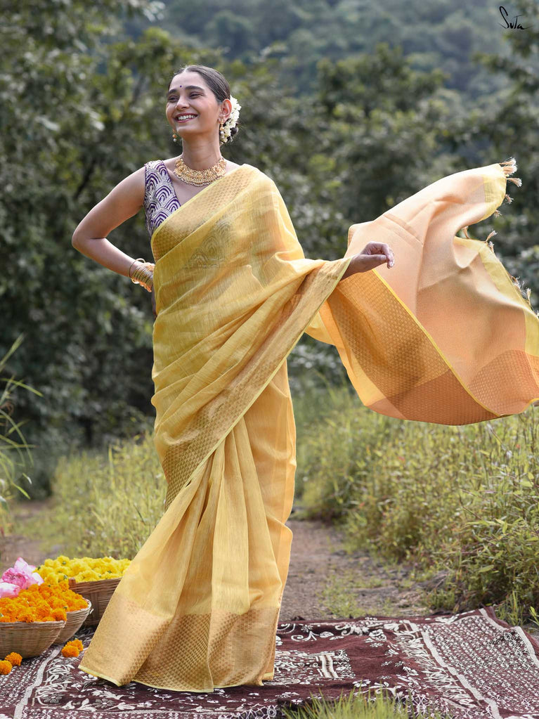 A yellow saree that feels like pure sunshine. The colour radiates warmth and optimism, lighting up every room you walk into. The geometric zari border adds structure and shimmer, keeping the look festive yet refined. Perfect for weddings and joyful celebrations. Comes with a matching blouse piece, no fall.
