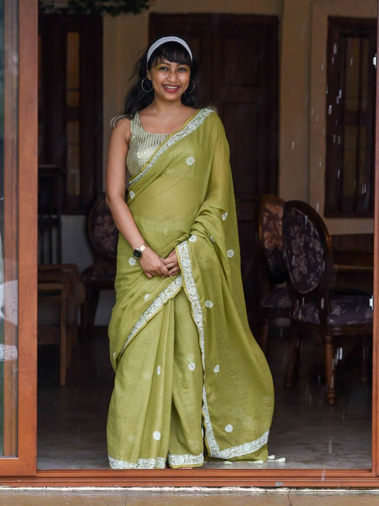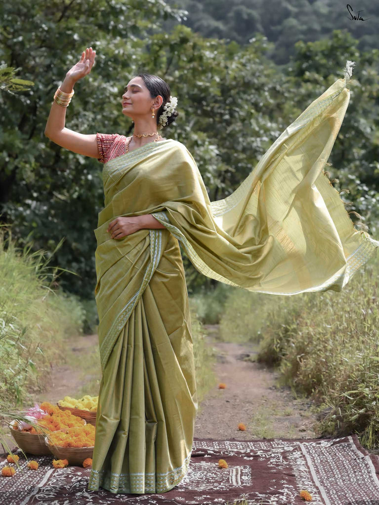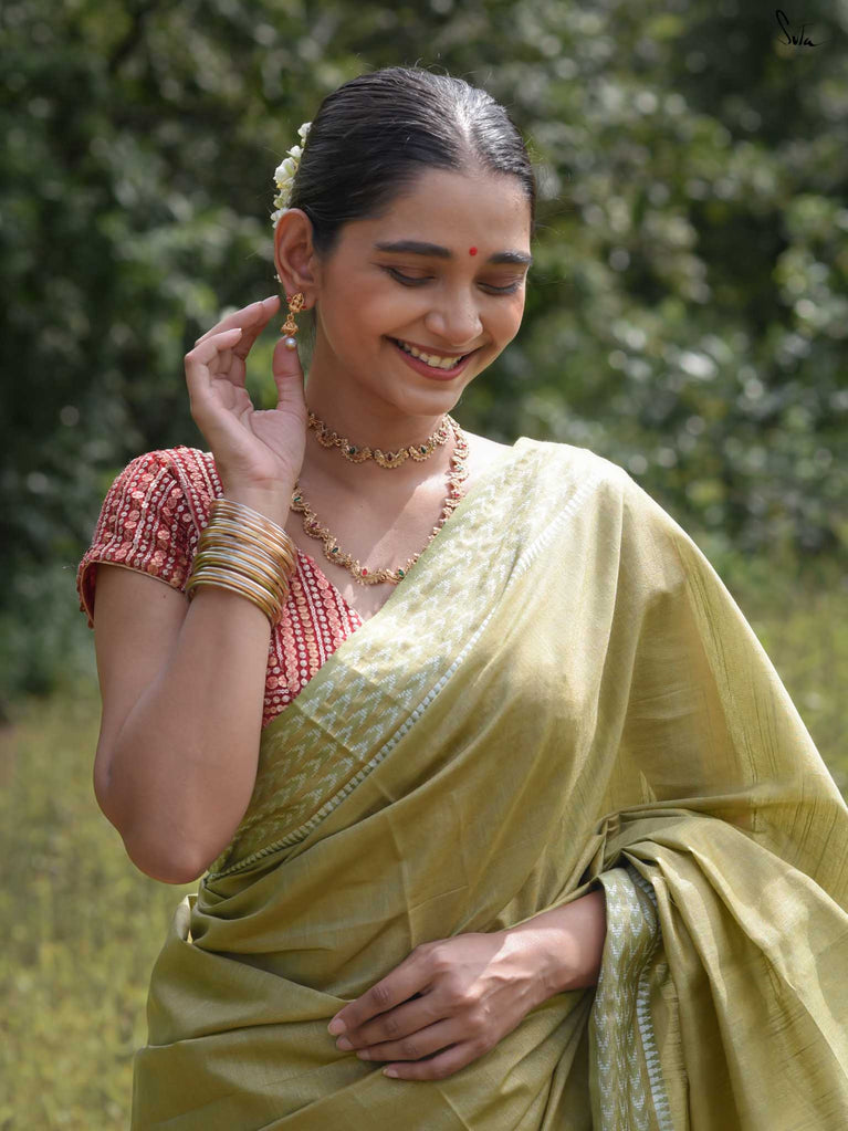 An olive green saree that feels grounded and graceful. The colour carries a sense of calm confidence and earthy charm. The geometric dobby border adds definition and style, keeping the look elegant and festive. Perfect for celebrations that call for subtle sophistication. Comes with a matching blouse piece, no fall.