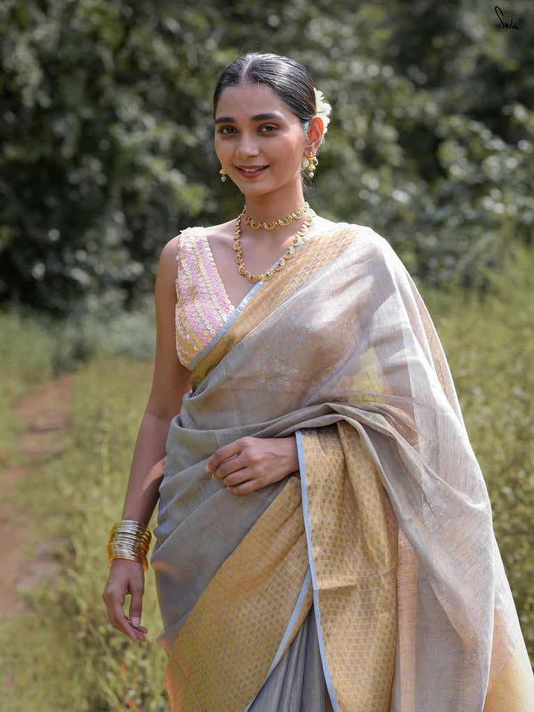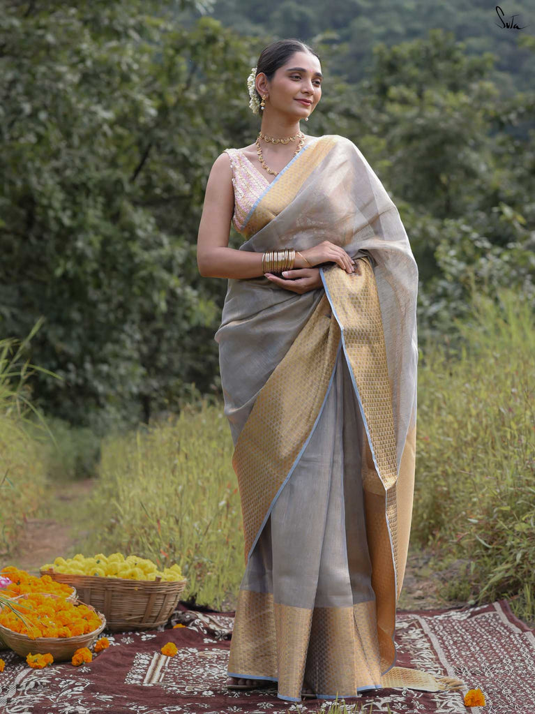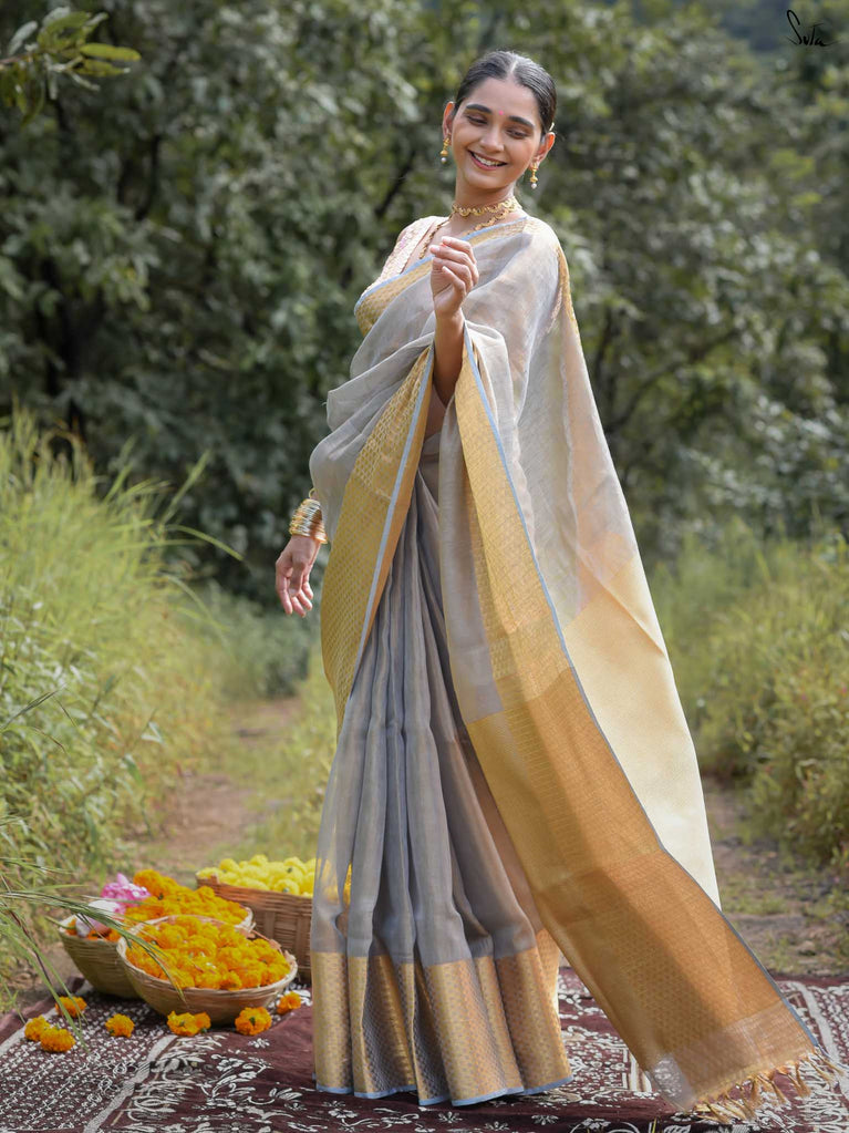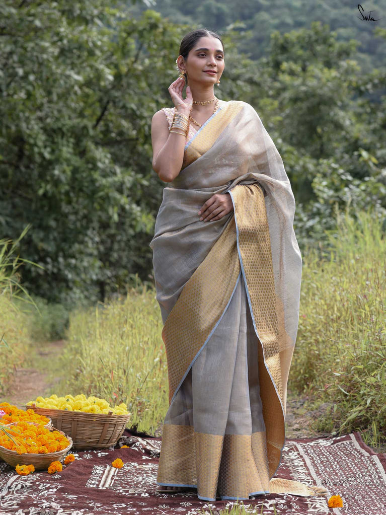 A grey saree that feels poised and powerful. The colour speaks of calm strength and quiet confidence. The geometric zari border adds shine and structure, giving the saree a modern edge. Perfect for festive occasions and elegant celebrations. Comes with a matching blouse piece, no fall.