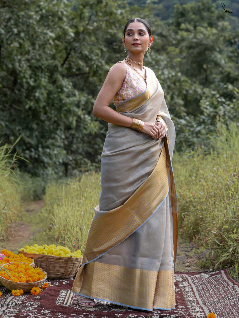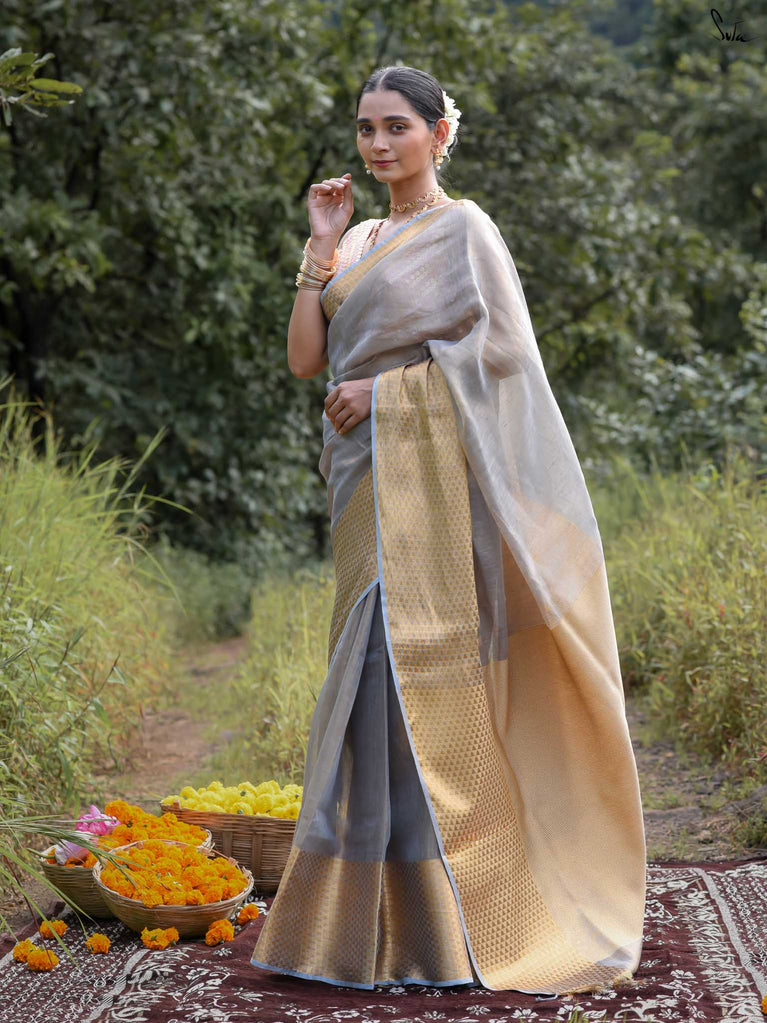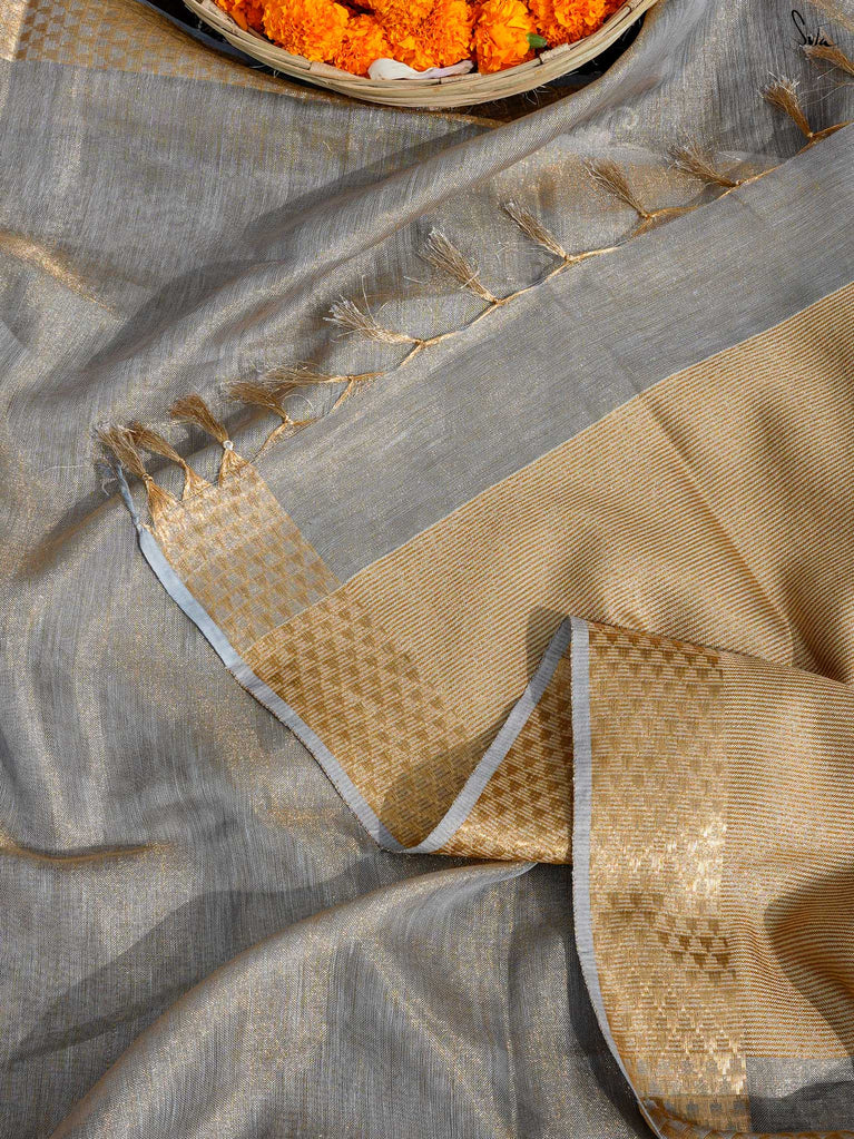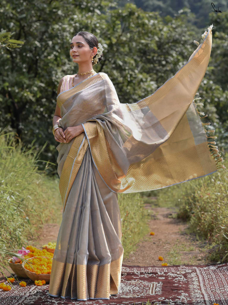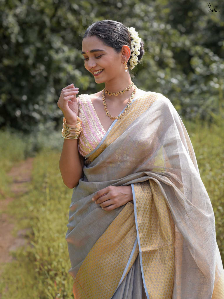 A grey saree that feels poised and powerful. The colour speaks of calm strength and quiet confidence. The geometric zari border adds shine and structure, giving the saree a modern edge. Perfect for festive occasions and elegant celebrations. Comes with a matching blouse piece, no fall.