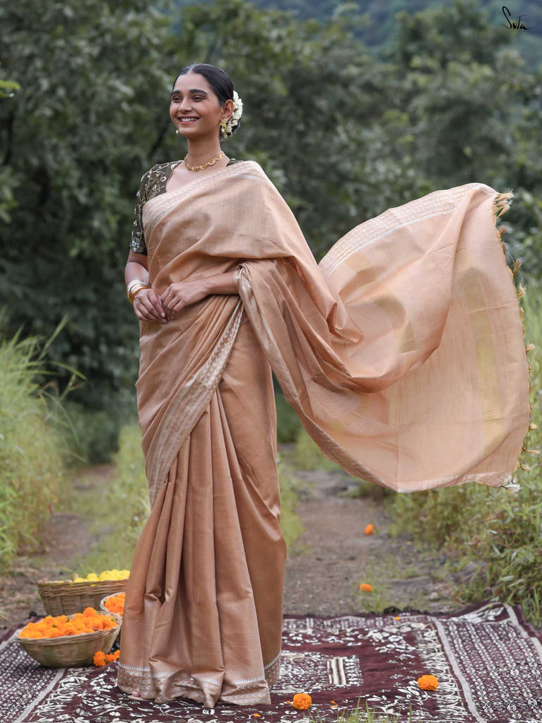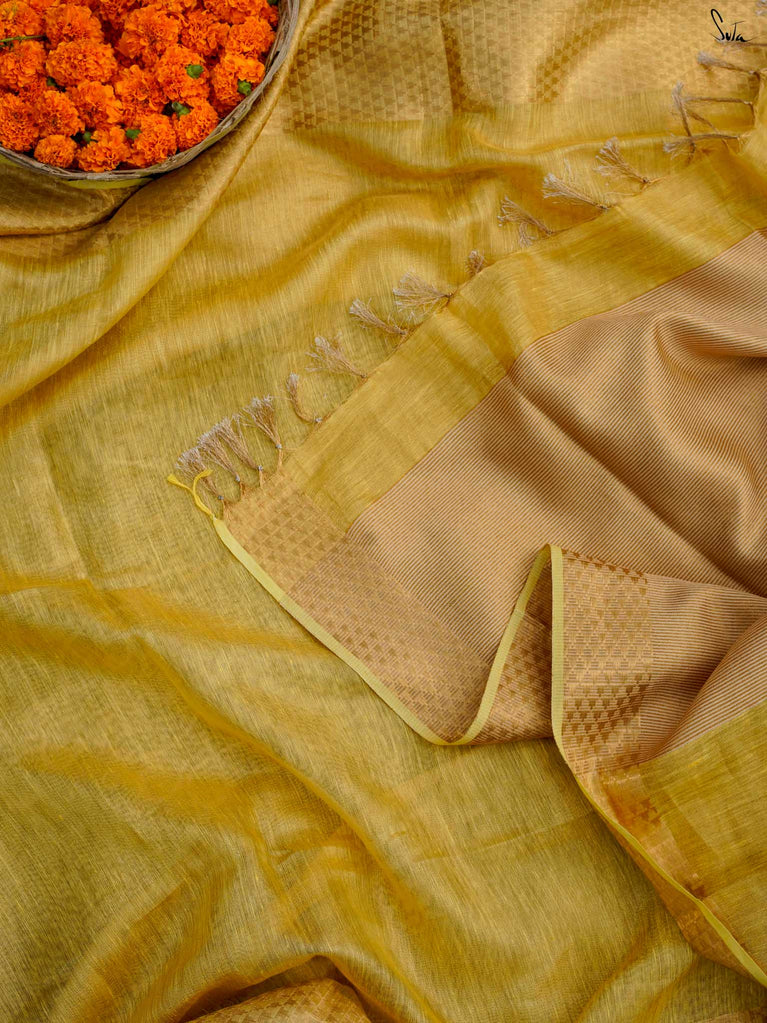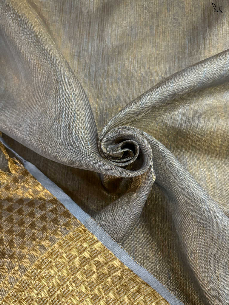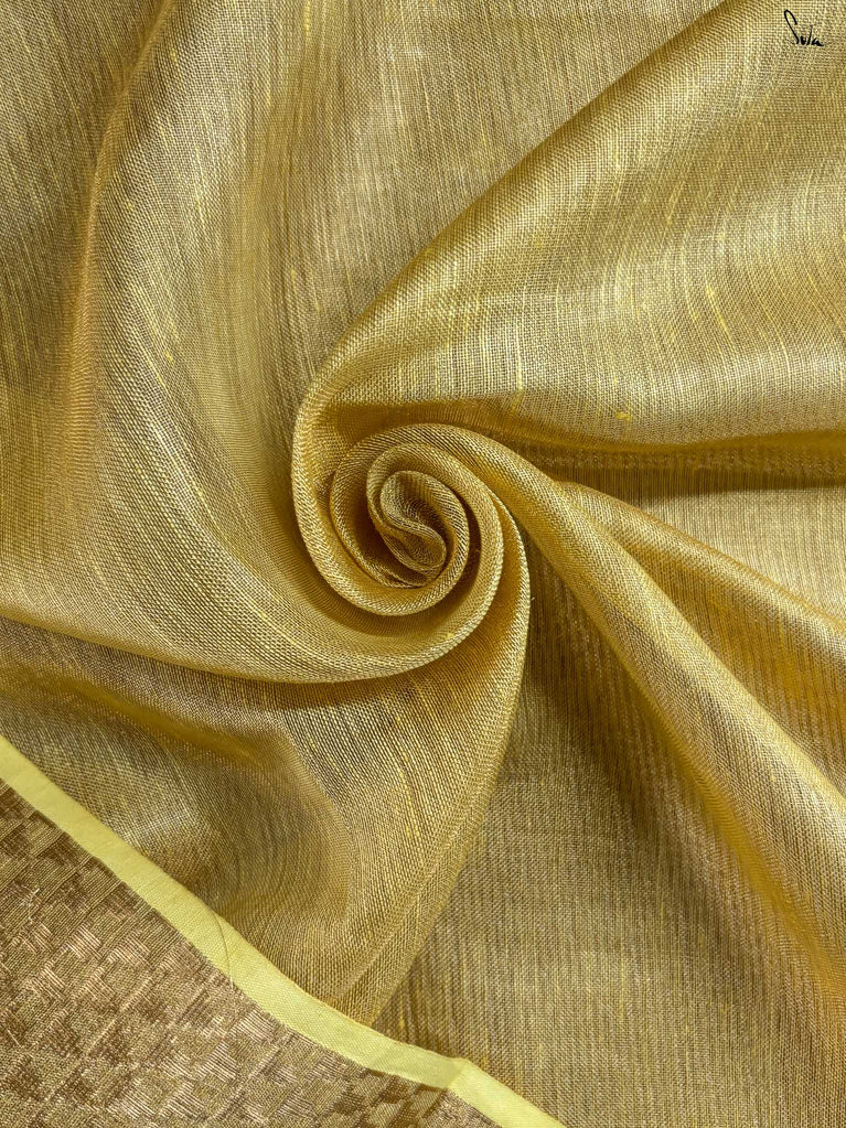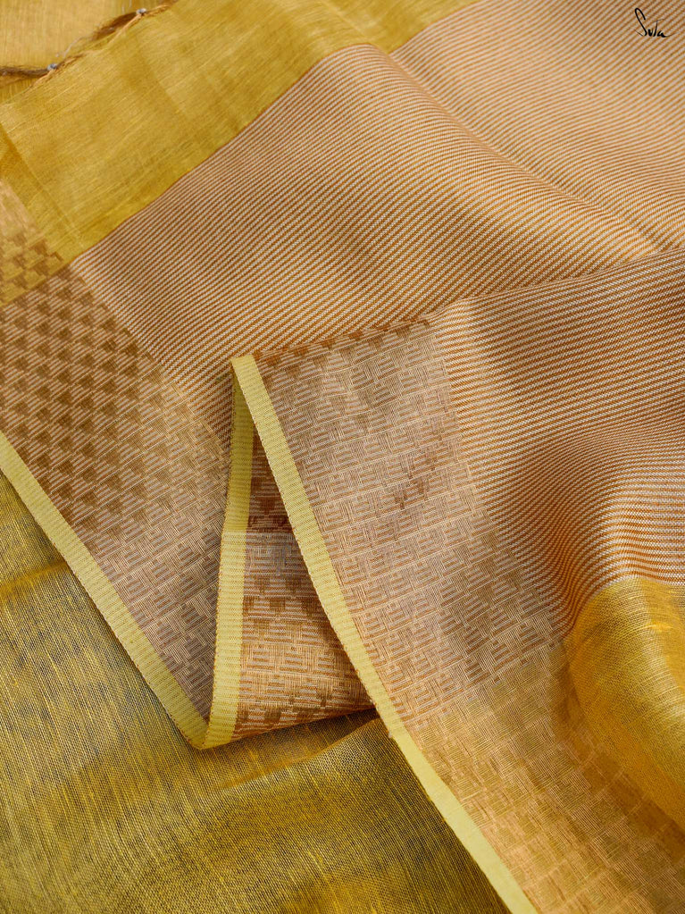 A gold saree that feels regal and luminous. The shade glows with liquid confidence and timeless charm. The geometric dobby border adds texture and balance, giving the saree a refined finish. Perfect for festive evenings that call for effortless elegance. Comes with a matching blouse piece, no fall.