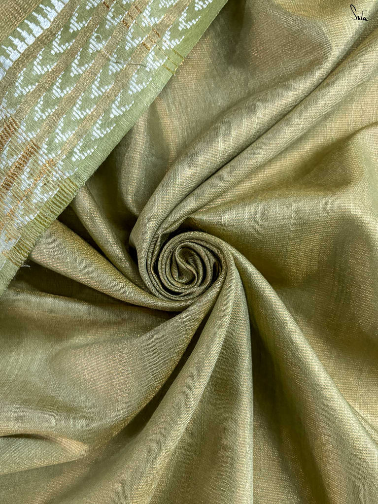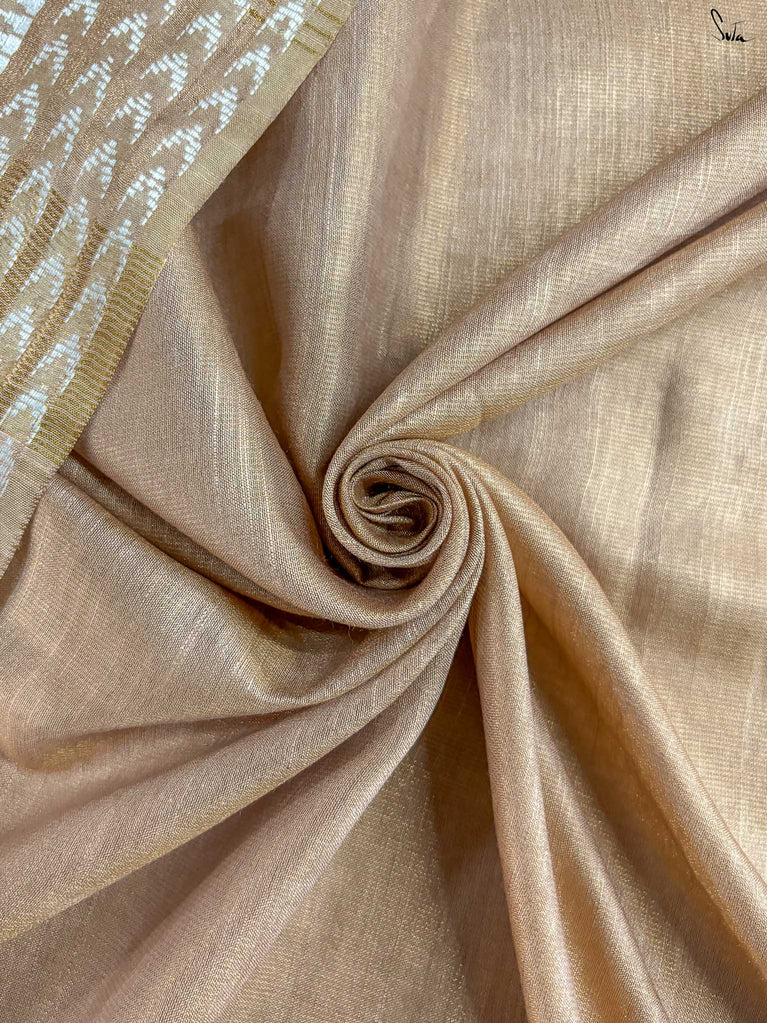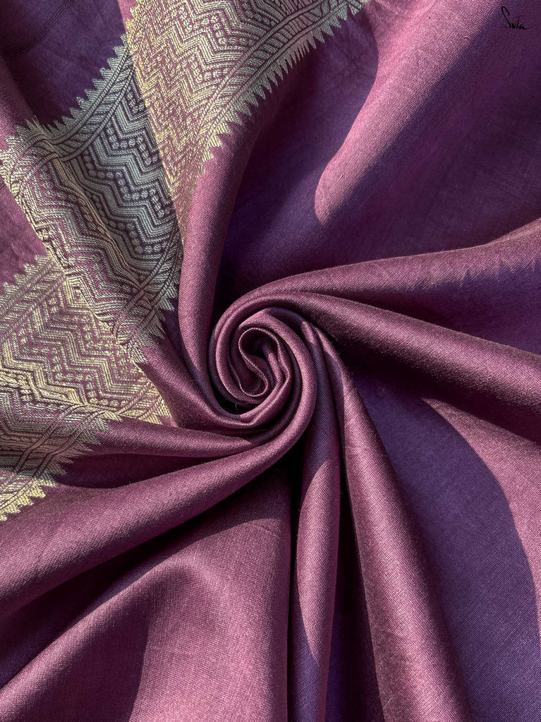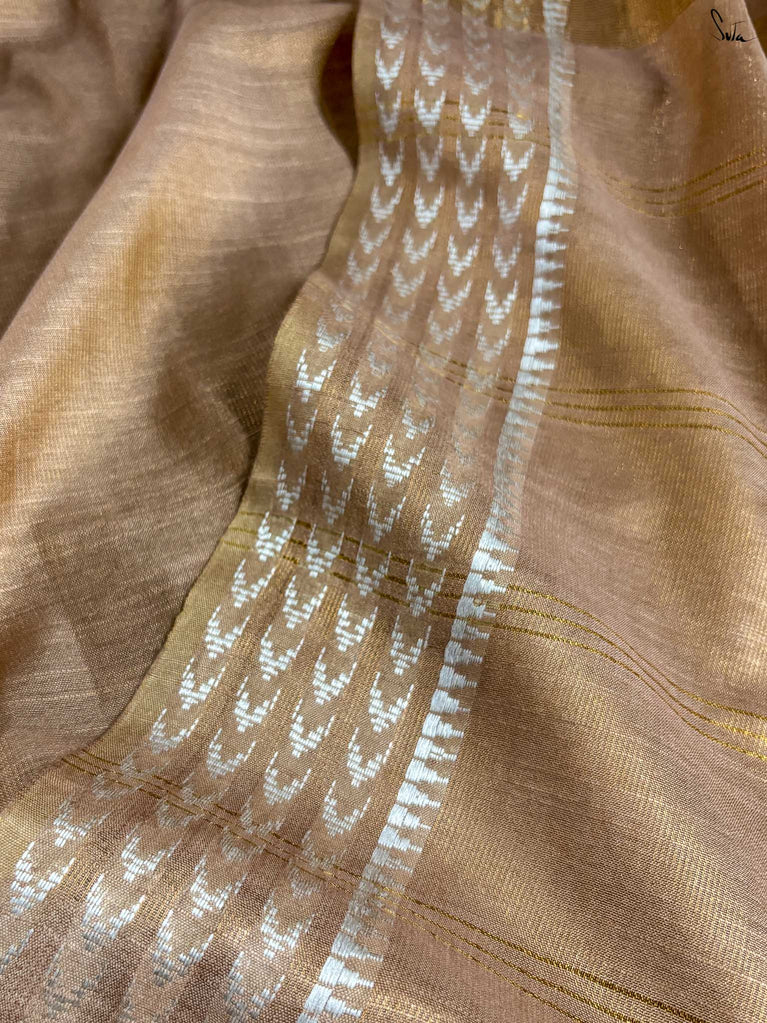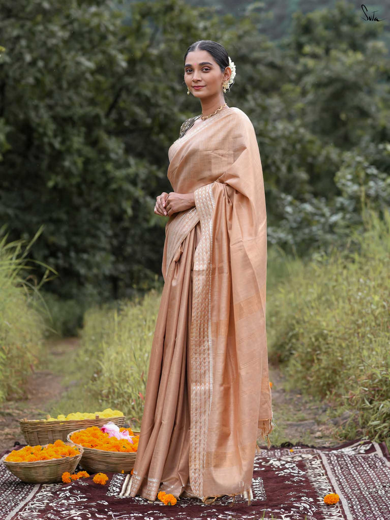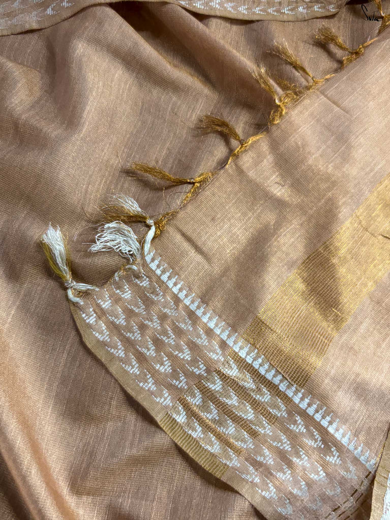 A gold saree that feels regal and luminous. The shade glows with liquid confidence and timeless charm. The geometric dobby border adds texture and balance, giving the saree a refined finish. Perfect for festive evenings that call for effortless elegance. Comes with a matching blouse piece, no fall.