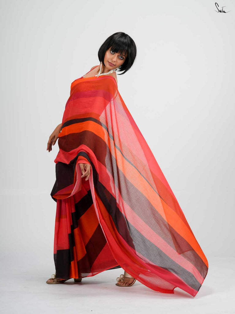 A rainbow of tradition, this multicolored mul khesh saree captures the essence of Holi in its vibrant, handwoven stripes. Each handwoven thread tells a story of craftsmanship passed down through generations, woven with care and joy. The playful jhalar tassels, like droplets of color, swing with every step, carrying a mischievous wink that only the festival of colors can bring. Wrapped in this saree, you’re wearing the spirit of an age-old tradition, reimagined for today’s celebrant.