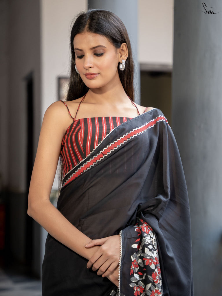 Su, the model is wearing size S blouse and the saree is Flying to the Moon Polka.