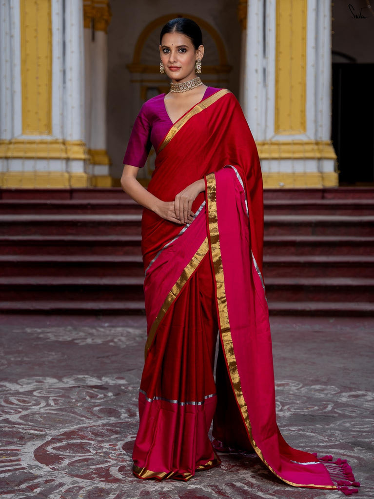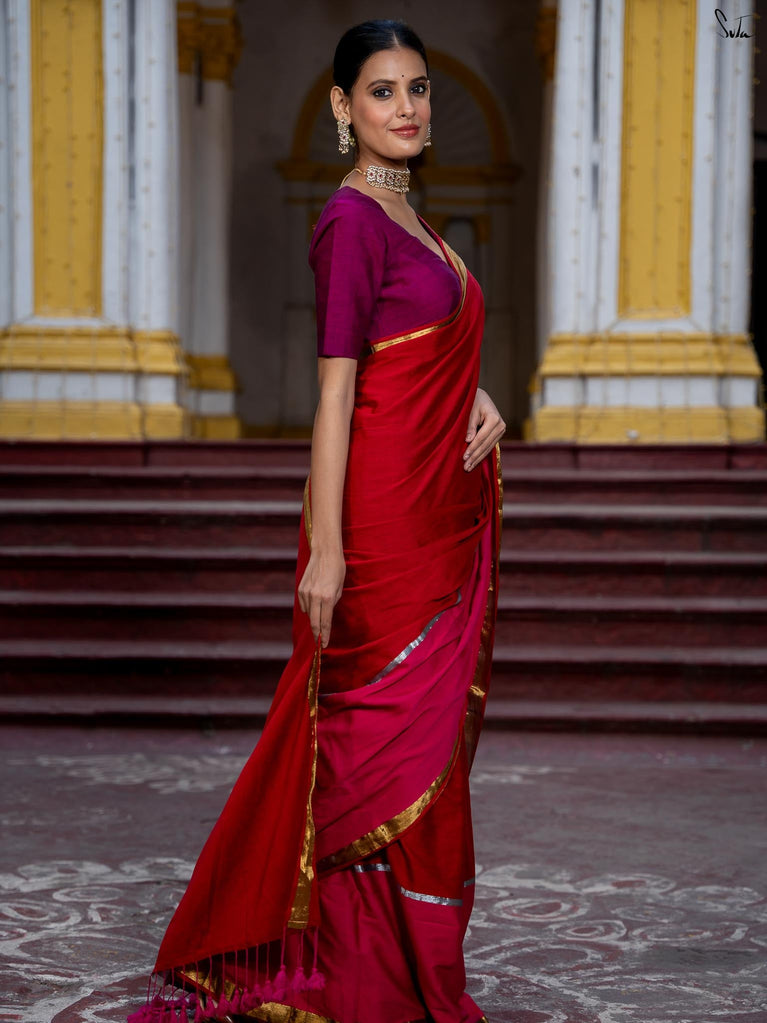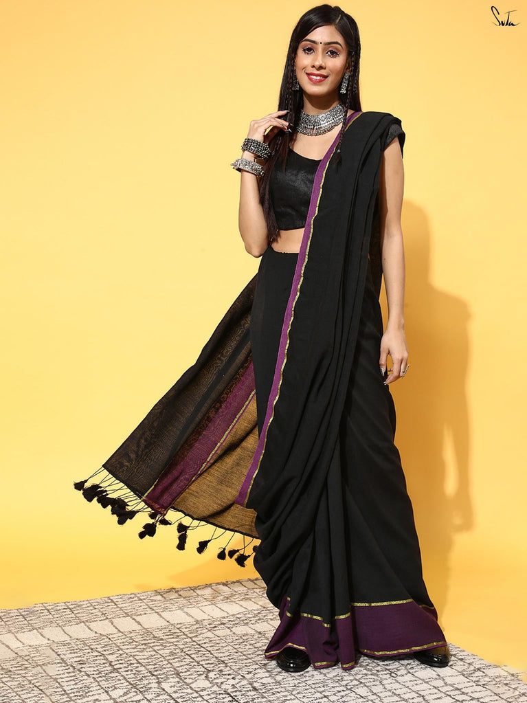 This gorgeous made-in-heaven mul cotton saree in purple with pink tassels and beautiful Ghicha lines on the pallu and zari border is enough in itself to make a stunning statement!