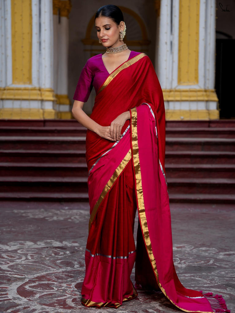 This is a made-in-heaven mul saree with Ghicha lines on the pallu and zari border.The mul cotton is what we call ˜made in heaven at Suta. Known in many parts of India as mul mul, the fabric is buttery soft, flowy and delicately beautiful. This fine 100% cotton weave of a fabric is extremely fluid! It is also very light and feels like second skin. It is also very practical as summer attire and dries easily in monsoons as well! With the right care, it becomes softer and softer with every wash and truly feels like a hug that wraps you in its love!Ghicha silk is a unique kind of silk made from silk threads obtained from the cocoons of a specific kind of silkworm, in a similar way as Tussar, except that here the fibres are made of cocoons that do not get reeled for Tussar silk due to being pierced or cut. The Ghicha detailing on the pallu and zari border bring the drape alive and it radiates prettiness!