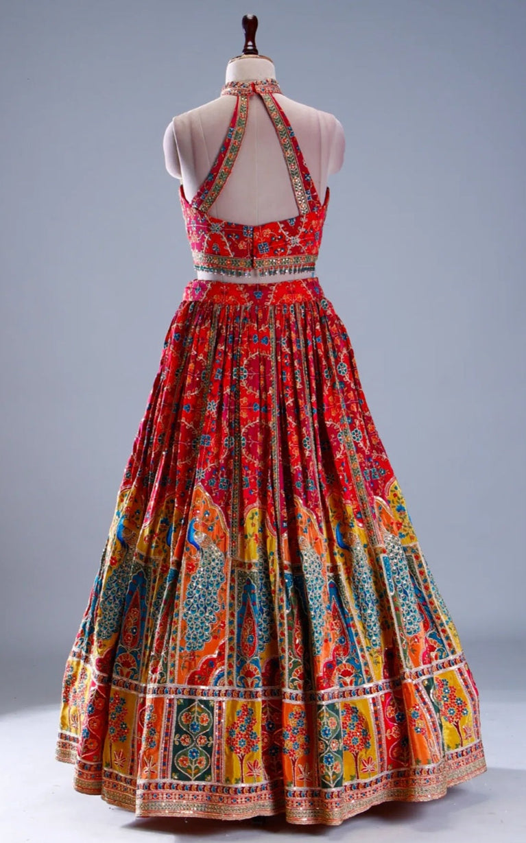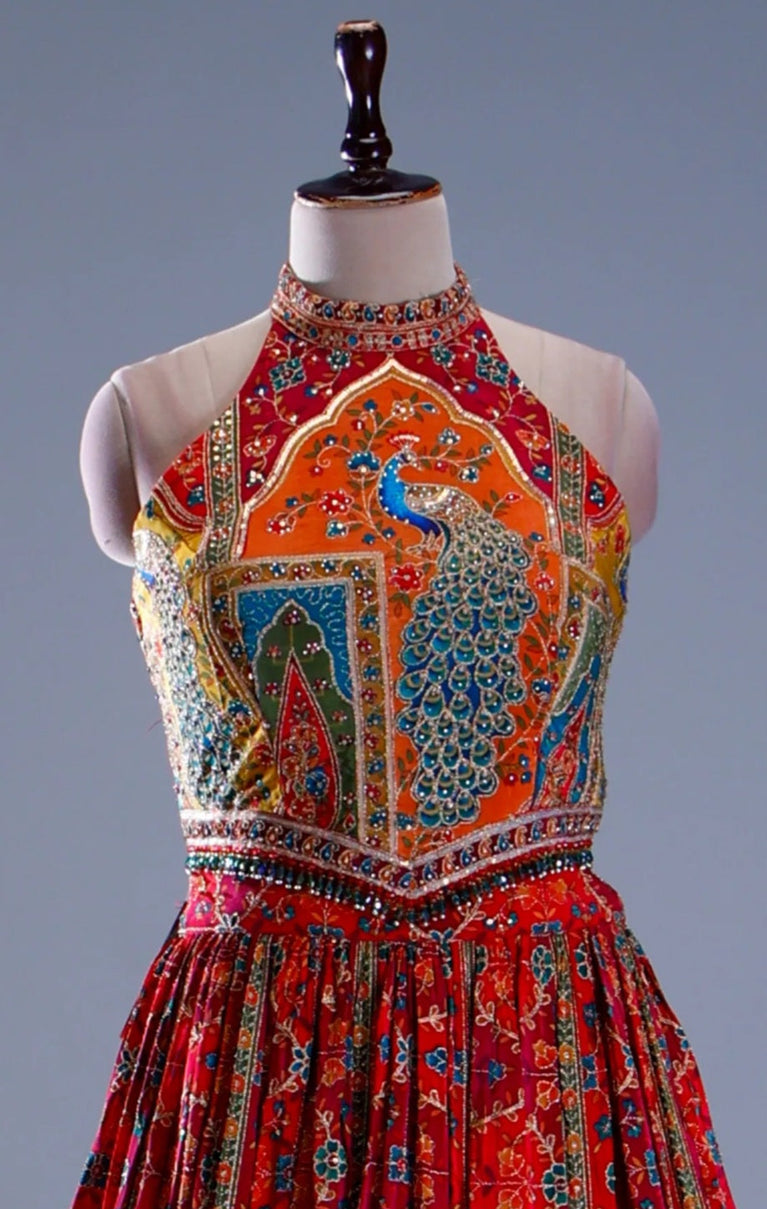 This multicolor peacock georgette lehenga features a bold, heavy peacock print across the blouse and all over the lehenga, creating a striking statement look. Finished with a contemporary halter-neck blouse, the ensemble blends artistic flair with modern elegance—perfect for festive occasions, sangeet functions, and cocktail celebrations.