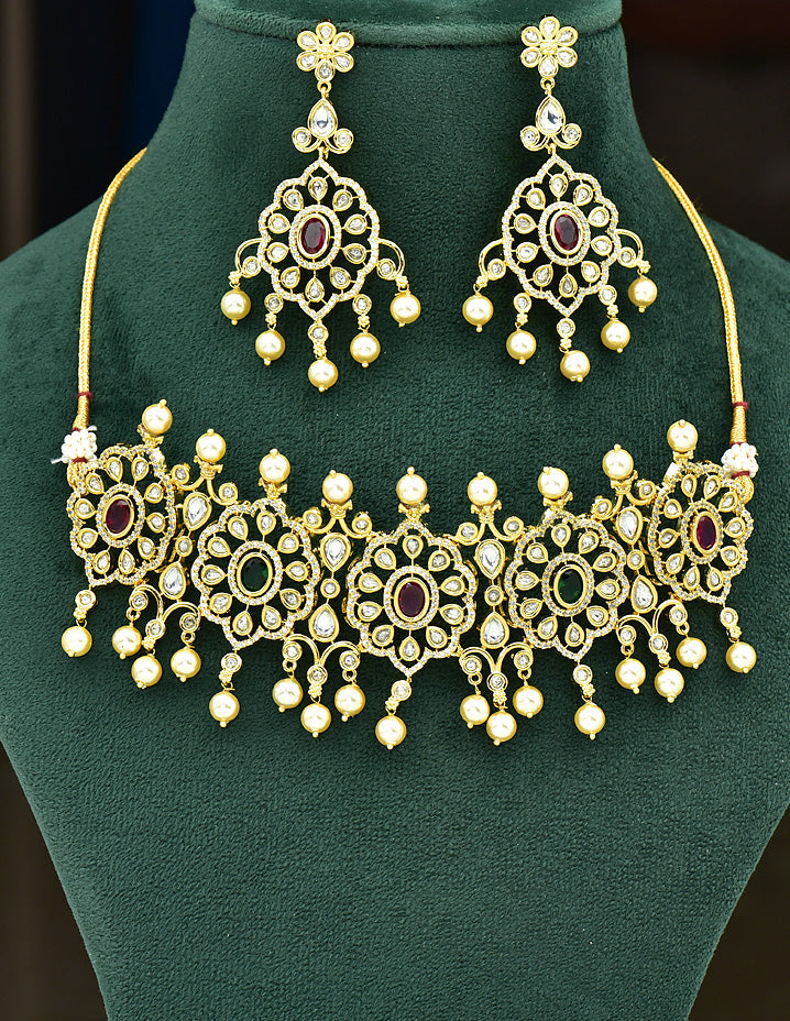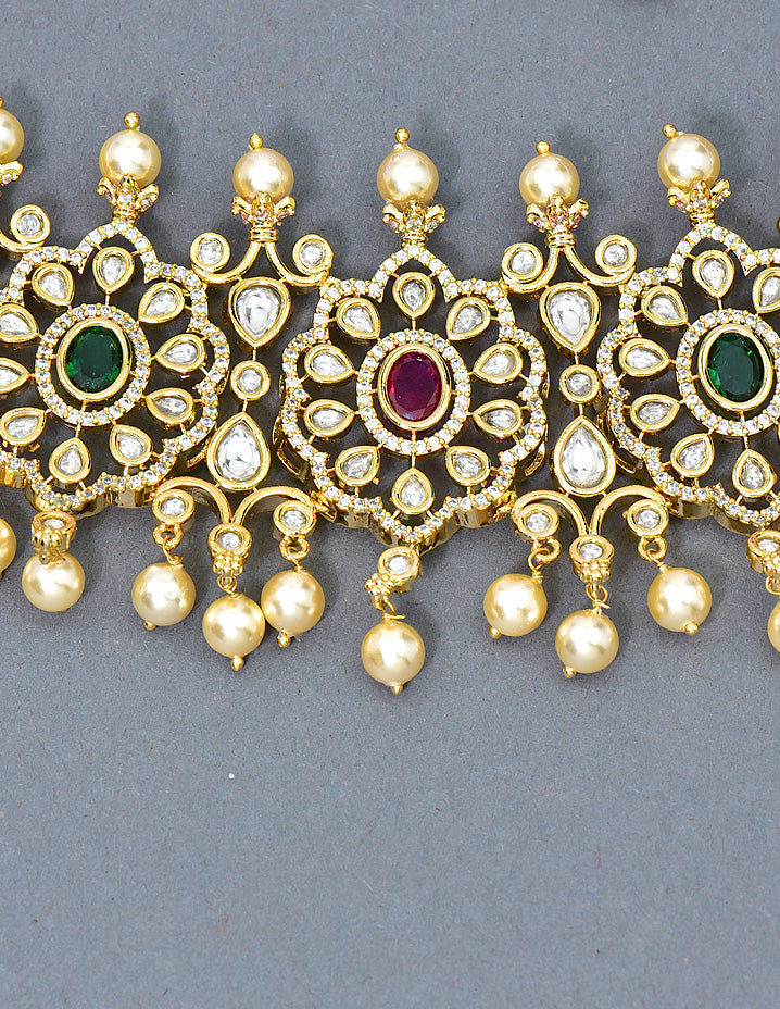 Jazz up your wedding or reception party looks with this picture-perfect choker set. This CZ choker set with sparkling Ruby, Emerald & White with gold polish is an absolute work of art. You can pair it with any simple saree and quickly dress it up. Making a style statement with this choker set will be a cakewalk for anyone!