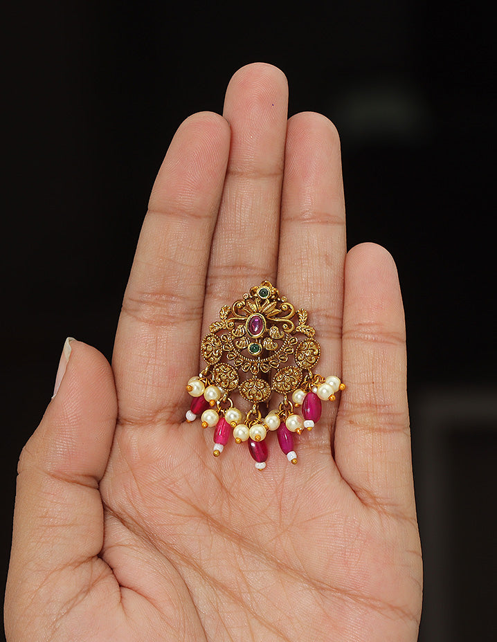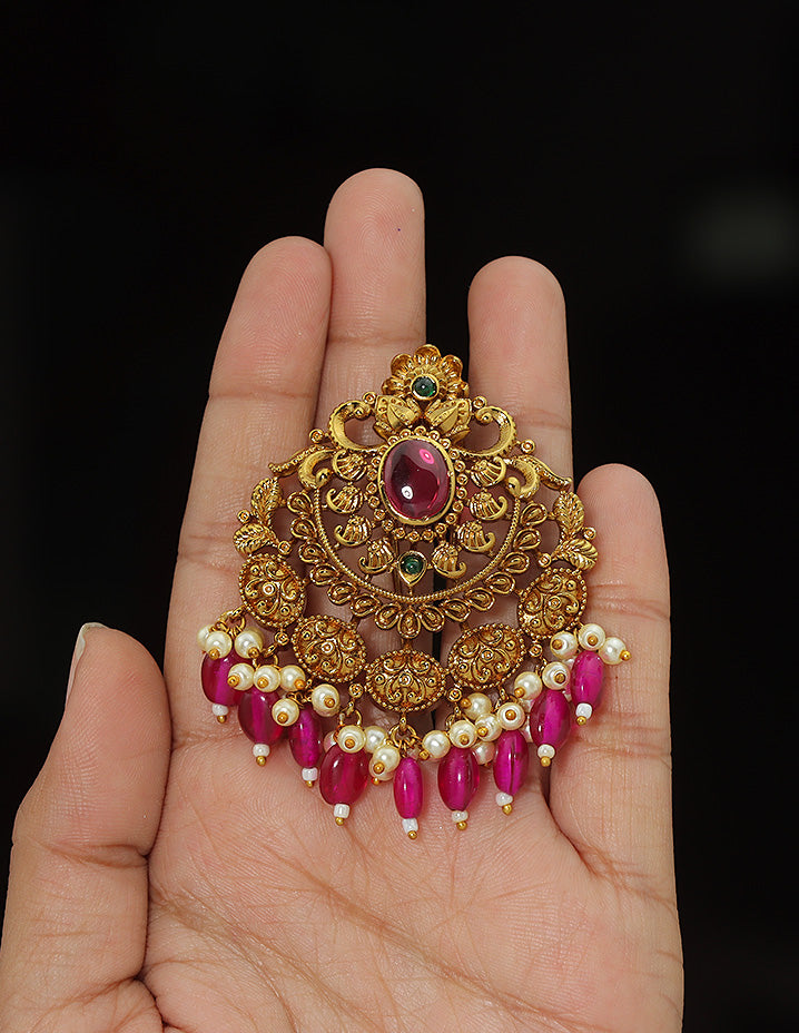 A majestic temple-style Choti Piece featuring an ornate gold finish, centered ruby stone, intricate motifs, and rich danglings of pearls and ruby beads—perfect for traditional grandeur.