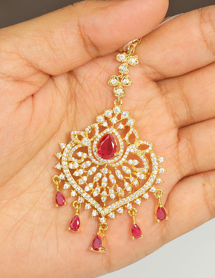 An exquisite gold-toned maang tikka featuring a central ruby-red teardrop stone, surrounded by sparkling CZ stones in an ornate heart-shaped design. Finished with ruby droplet danglers, it's perfect for bridal and festive looks.