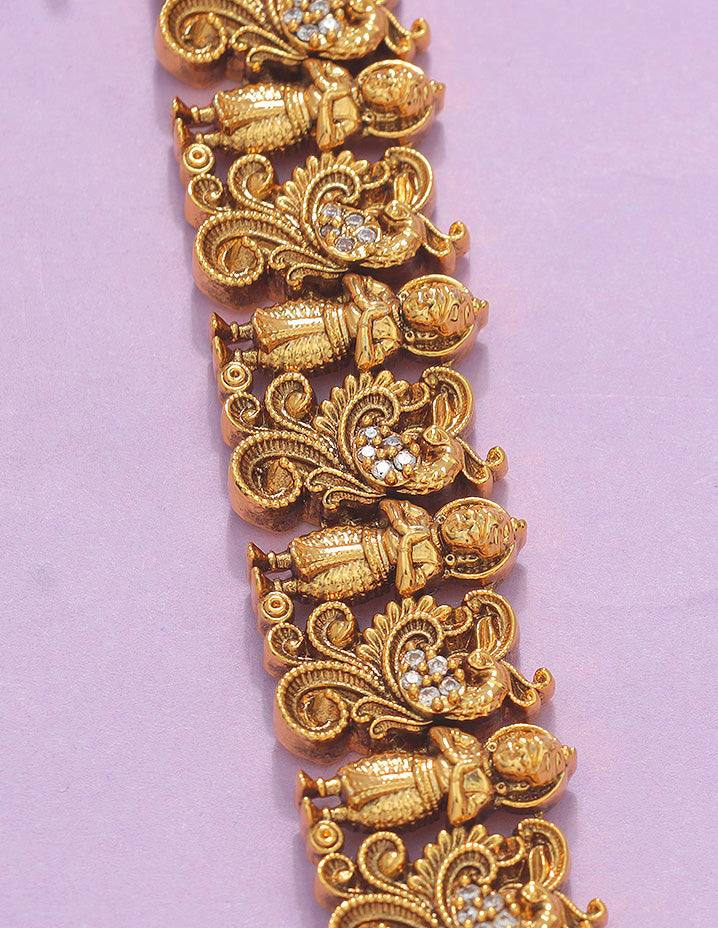 This Matt Gold Plated Kempu Long Haram Set, adorned with AD stones, is a celebration of timeless tradition. Paired with matching earrings, it’s the perfect pick to elevate your ethnic style with regal elegance.