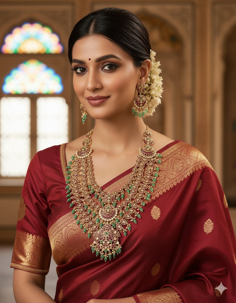 Grace your traditional look with this Matt Kempu Long Haram, featuring radiant ruby & emerald stones. Complete with matching earrings, it’s a timeless piece that adds rich desi charm and makes every occasion special.