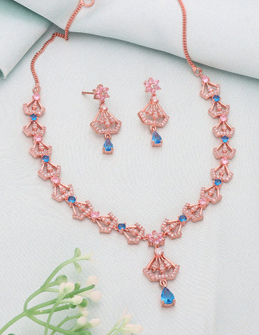 This stunning GJ-polish CZ necklace set is the perfect blend of elegance and charm. Its eccentric design, studded with sparkling American diamond stones, is a true visual treat.