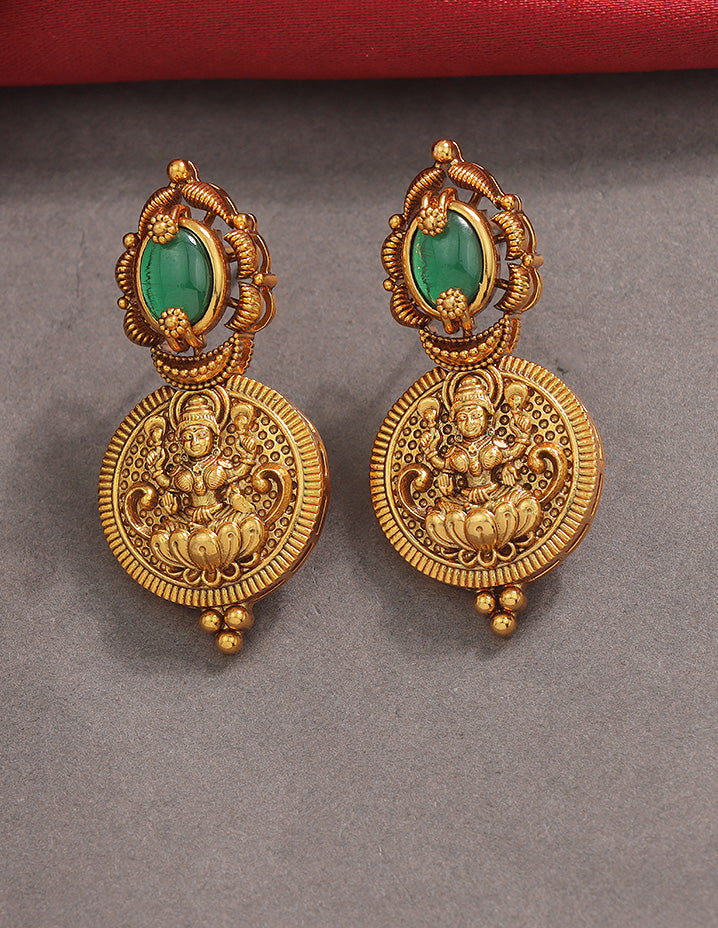 The Designer Matt Lakshmi Devi Kasula Kempu Necklace Set caters to customers who appreciate traditional South Indian jewelry with intricate temple-inspired designs. It attracts those seeking timeless elegance and cultural depth in their statement pieces.