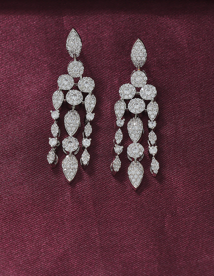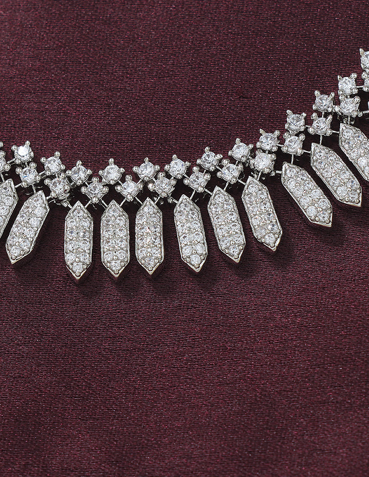 This Designer Zirconia Elegance Necklace Set features sparkling white stones enhanced by a durable rhodium polish. Its refined craftsmanship adds a sophisticated glow to any ensemble.