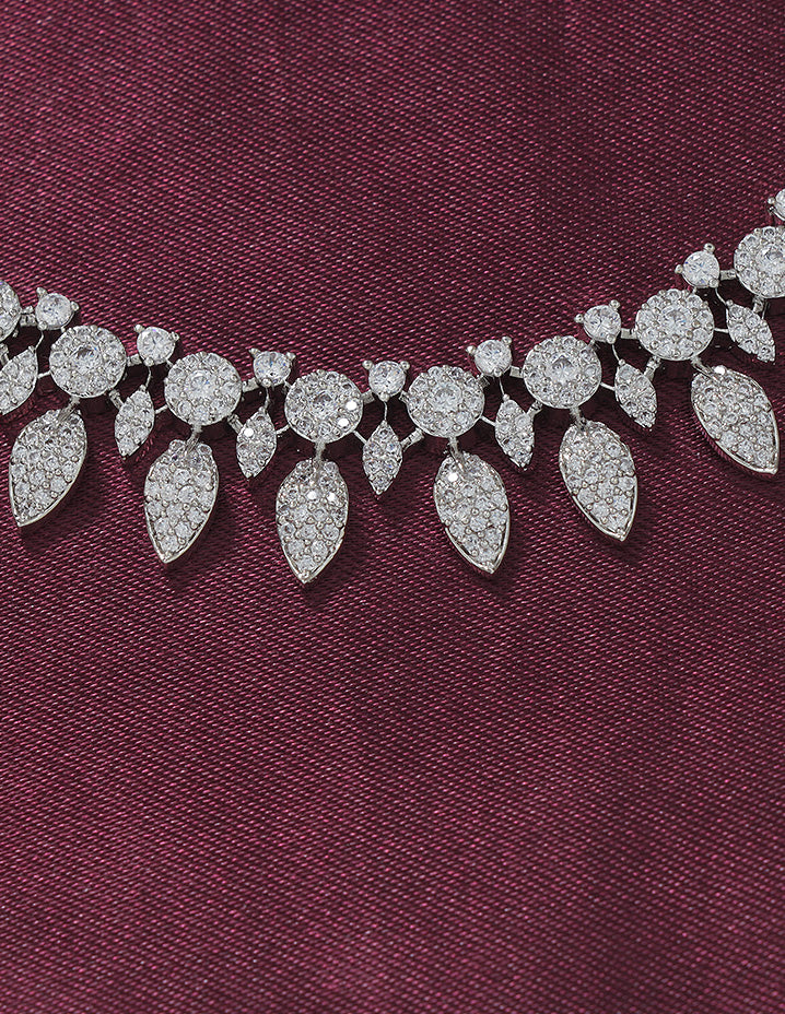 A radiant rhodium-toned necklace and earring set adorned with sparkling Bud and floral motifs, perfectly blending elegance and charm for your special occasions.