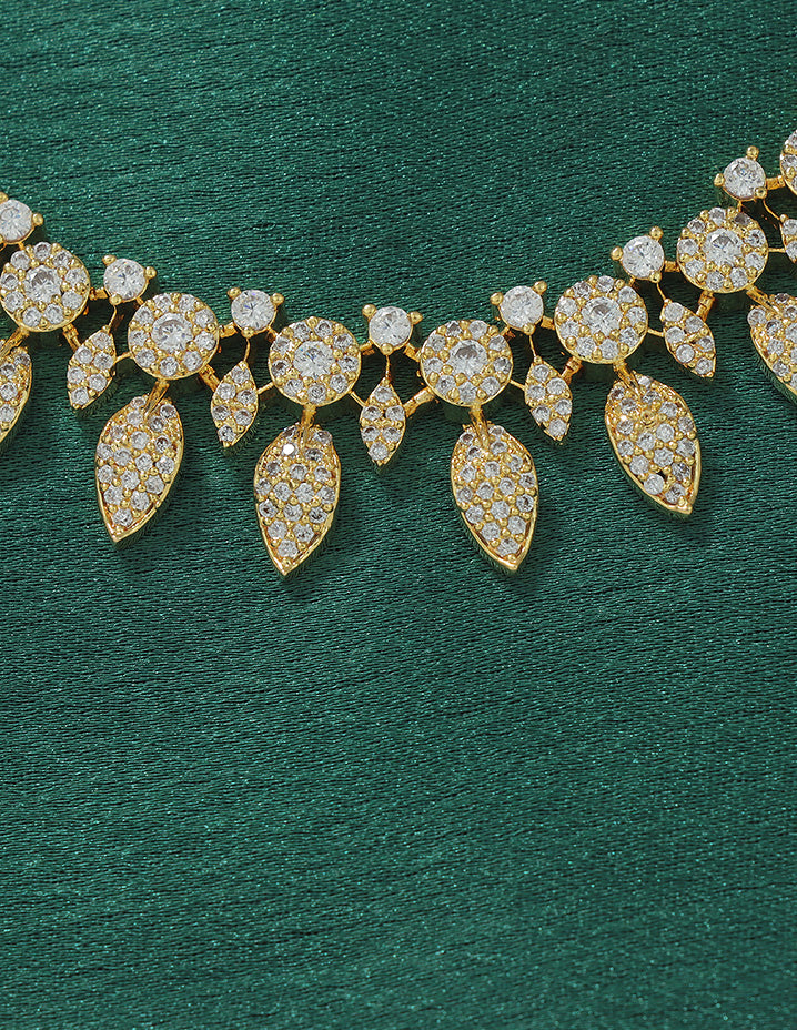 A radiant Gold-toned necklace and earring set adorned with sparkling Bud and floral motifs, perfectly blending elegance and charm for your special occasions.