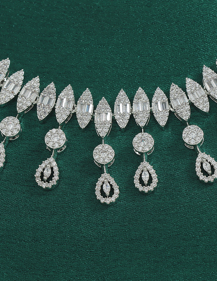 A radiant Rhodium-toned necklace and earring set adorned with sparkling Bud and floral motifs, perfectly blending elegance and charm for your special occasions.