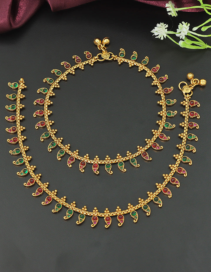 Adorn your ankles with elegance using the Paisley Grace Kemp Anklet Set, featuring vibrant ruby and emerald kemp stones in charming paisley motifs. A graceful blend of tradition and style, perfect for festive flair or everyday ethnic wear.