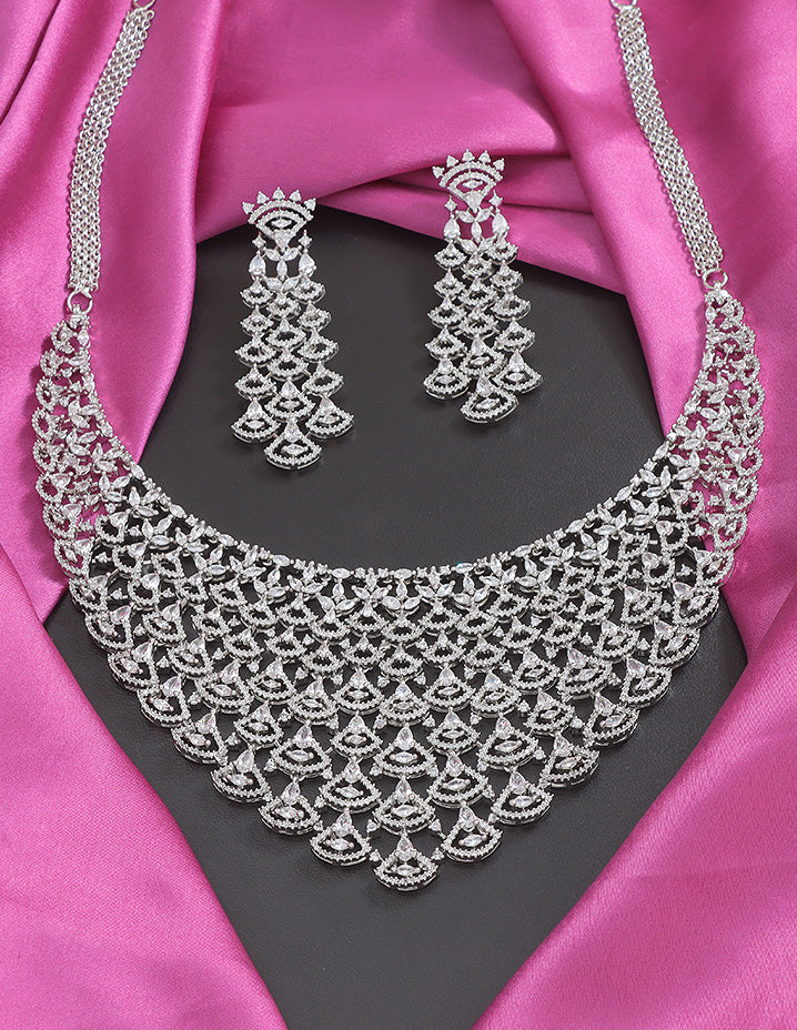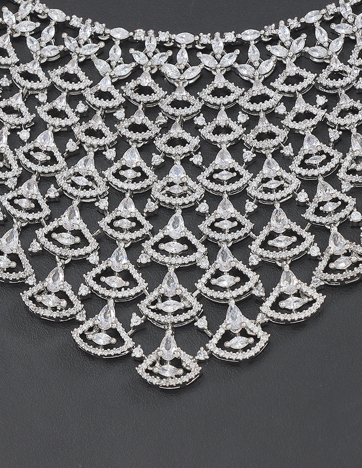 This Designer Zirconia Necklace Set features two elegant rows of dazzling white stones, creating a striking and sophisticated look. Crafted for bridal occasions, its heavy, full design ensures a bold statement, enhancing your ensemble with timeless brilliance and expert craftsmanship. Ideal for adding a luxurious touch to your special day.