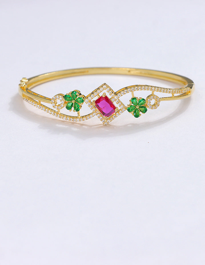 Stylish Gold Polish Bracelet studded with dazzling Rani Pink & Emerald & White American Diamonds for a classy touch. Perfect for daily wear, parties, or any special occasion!
