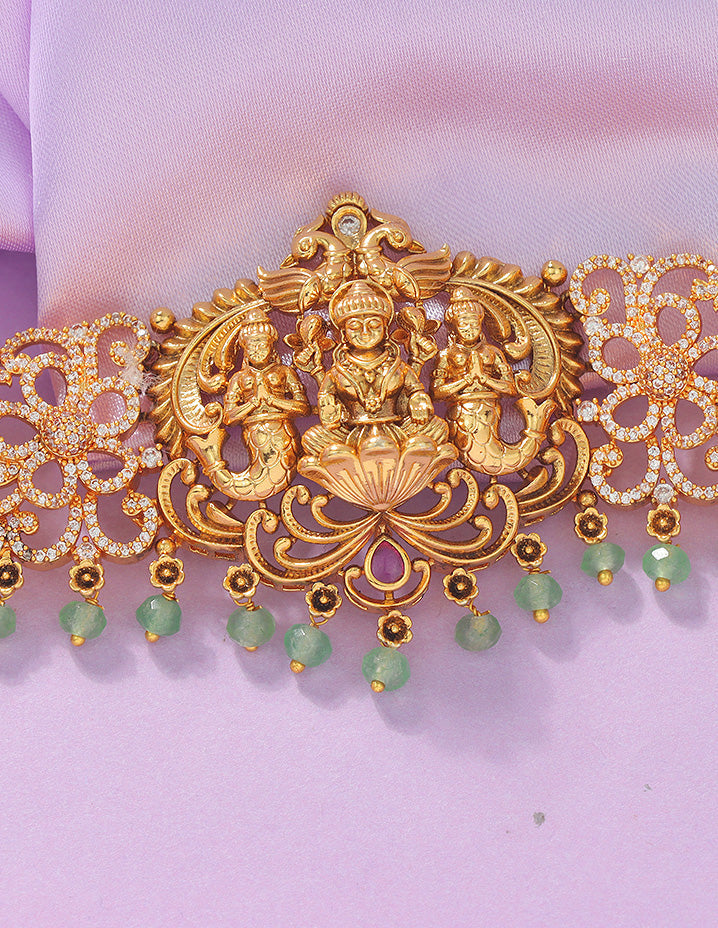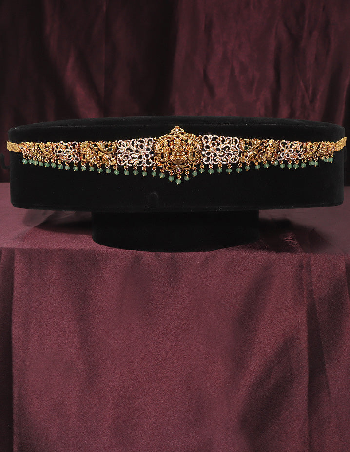 This Matt Chain Vaddanam has a chic and ethnic design. Adorned with CZ Stones, Pearls and green Beads attached as a Hanging to look Beautiful , it can be styled with various outfits, including indo-western ones.