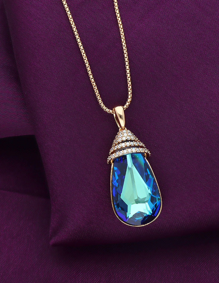 This Swarovski Crystal Aqua Blue Chain Pendant shines with its Blue crystal and elegant Gold polish. Stylish and sophisticated, it adds a touch of luxury to any outfit. A must-have for those who appreciate fine jewelry.
