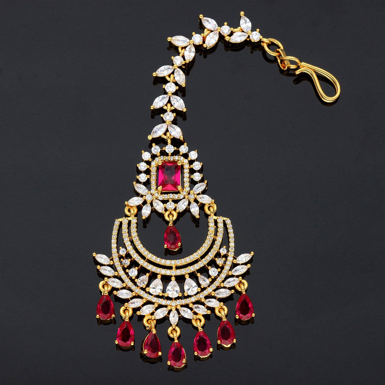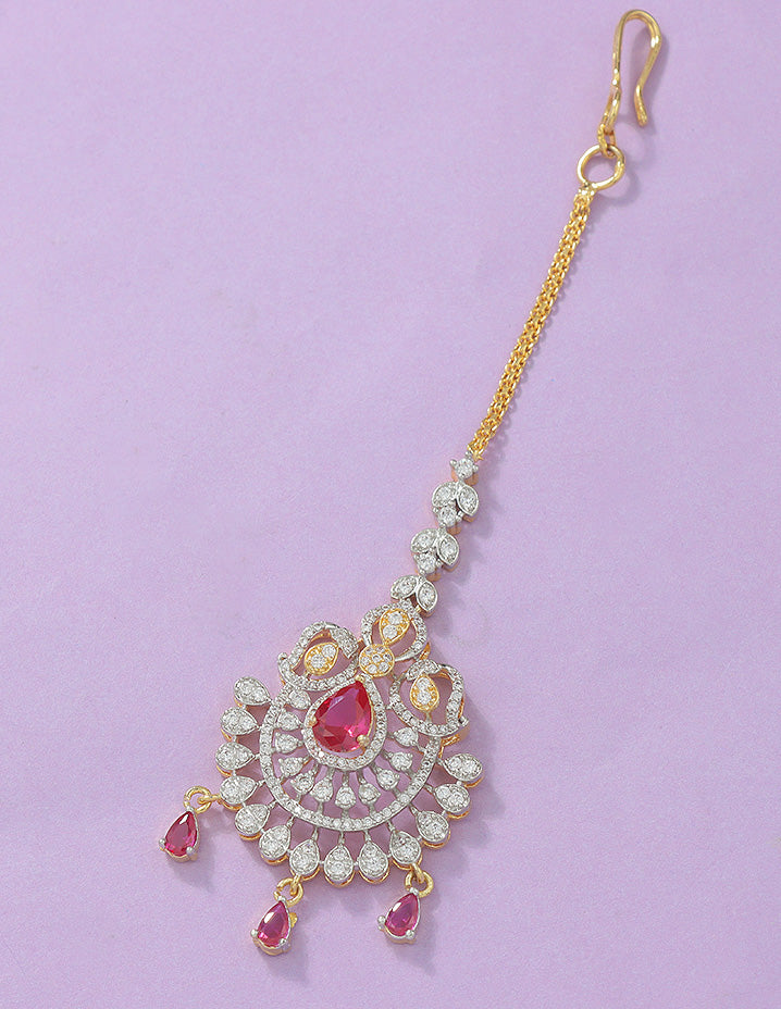 A dazzling maang tikka adorned with a bold rani pink teardrop centerpiece, surrounded by intricate patterns of CZ stones arranged like radiant petals. Finished with dangling ruby drops for an added touch of elegance and grace — perfect for bridal or festive looks.