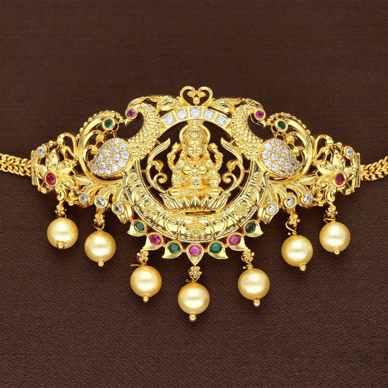 Replace your outdated old bajuband with this scintillating new CZ bajuband. You can match it with your favorite saree or lehenga and flaunt your style. The dazzling American diamonds, rubies and emerald green stones make an amazing blend with the lustrous gold polish and the gorgeous design of the bajuband.
