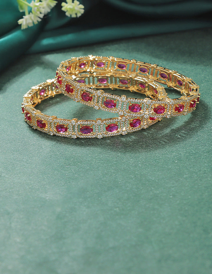 A luxurious blend of elegance and sparkle, these bangles showcase brilliant Ruby-cut green stones framed with shimmering white crystals. Set in a radiant gold finish, they are perfect for elevating your look at weddings, parties, or festive occasions.