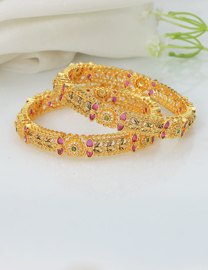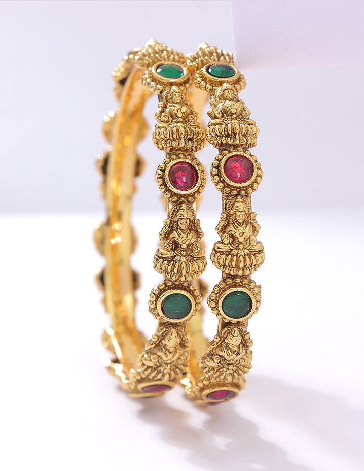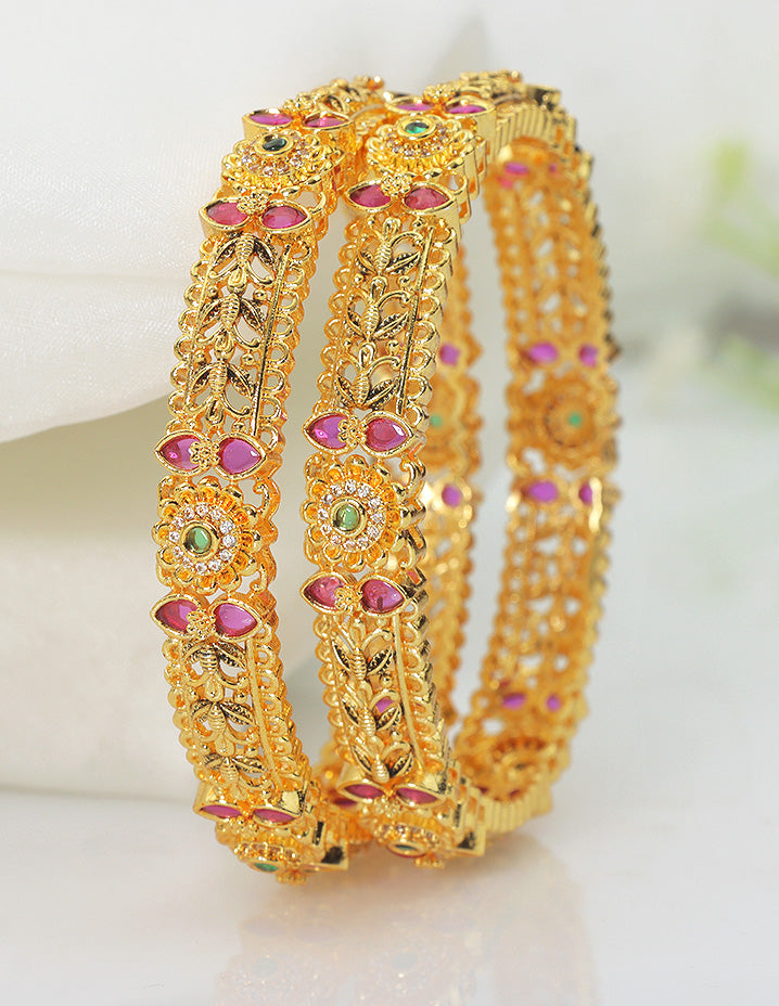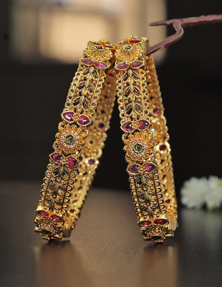A stunning pair of gold-finish bangles adorned with intricate floral carvings and vibrant red and green stone accents—perfect for festive elegance or timeless tradition.