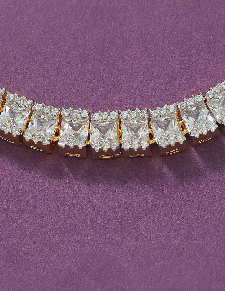 This Designer Zirconia Elegance Necklace Set features exquisite white stones set in a refined gold and rhodium polish, offering timeless sophistication. Perfectly crafted to elevate any ensemble with expert attention to detail and lasting brilliance.