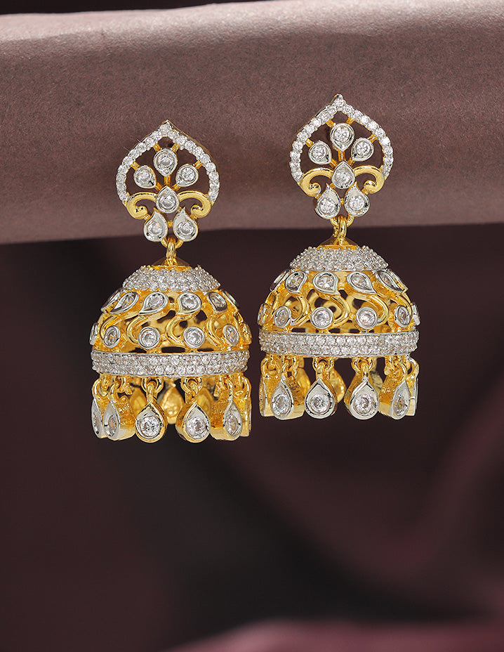 Designer earrings are classic jhumka-style danglers with a fusion of traditional and contemporary design. The bell-shaped drop is richly embellished with white stones and tear-drop dangles, paired with a sparkling oval top.