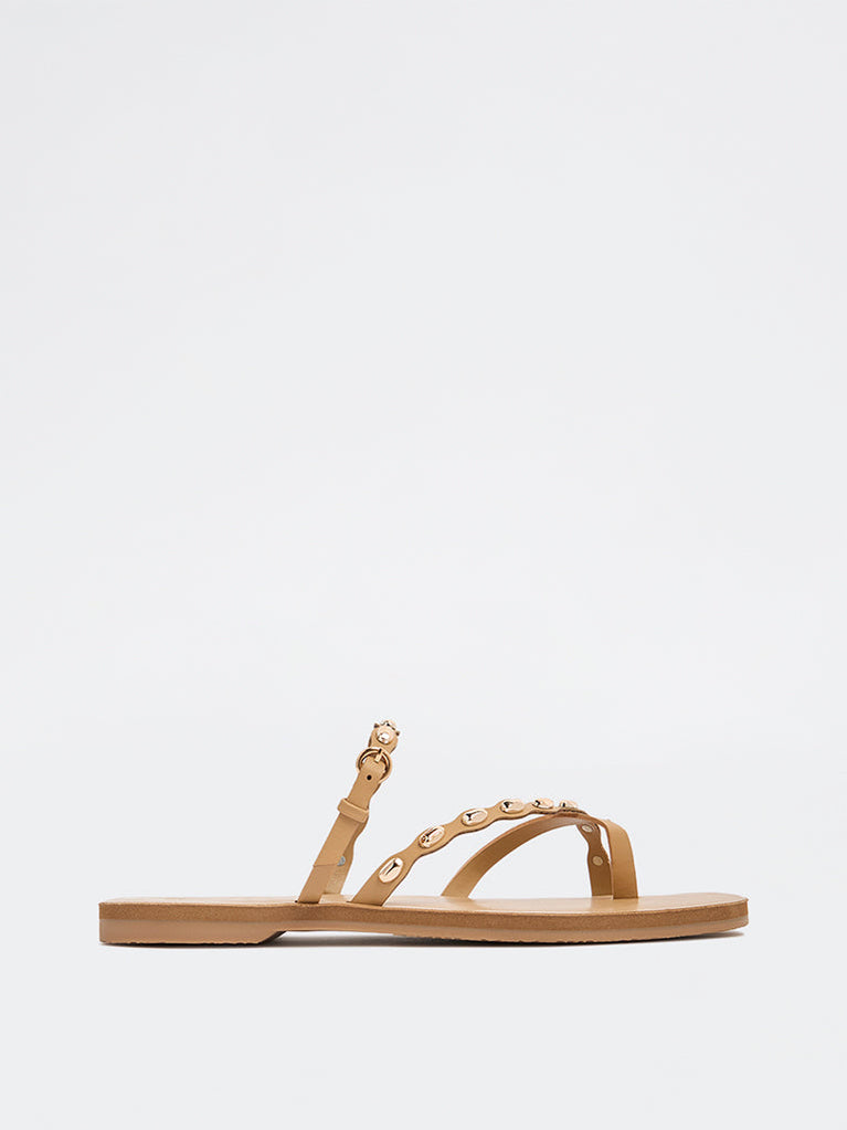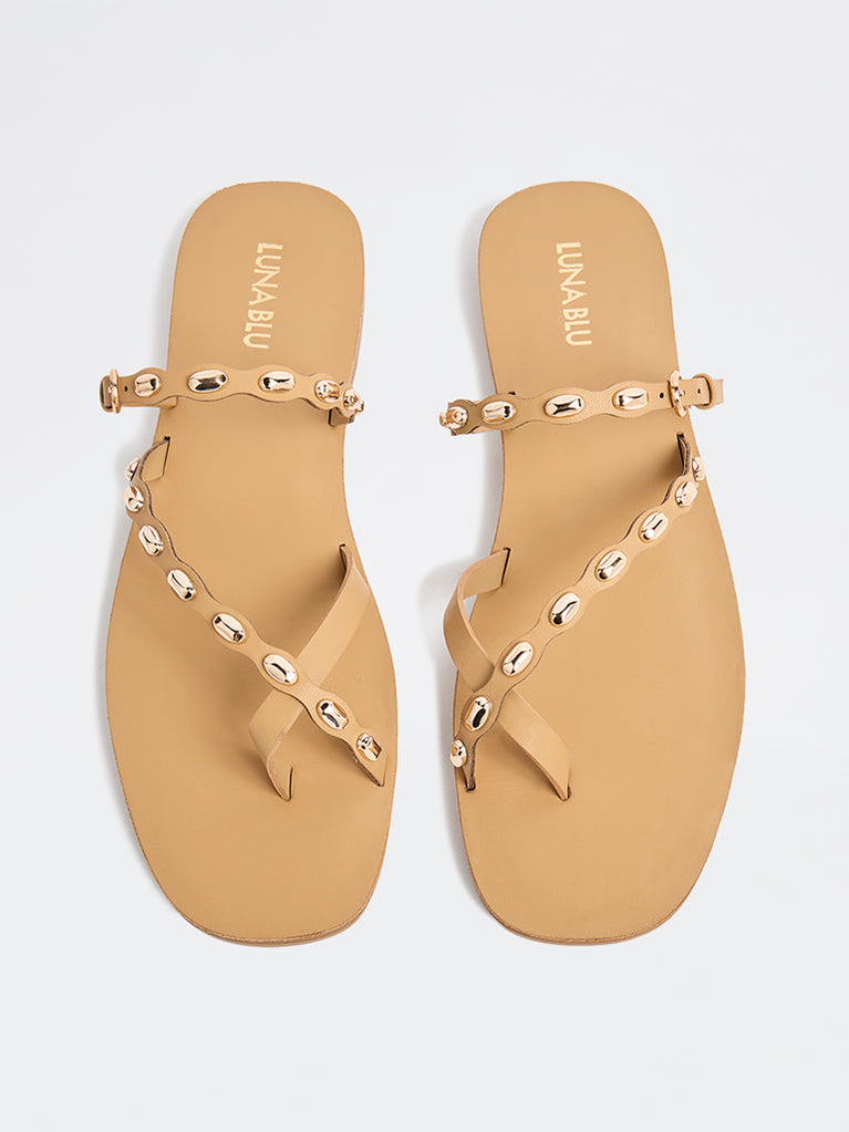 Designed for easy everyday wear, these beige slides from Luna Blu are crafted with slim straps embellished with metallic studs that bring focus to the upper. The toe-loop construction provides a secure hold, and the flat base keeps the profile light through the day. A padded footbed adds cushioning, while the textured outsole ensures reliable grip on varied surfaces. A versatile choice that pairs well with casual separates and weekend outfits.