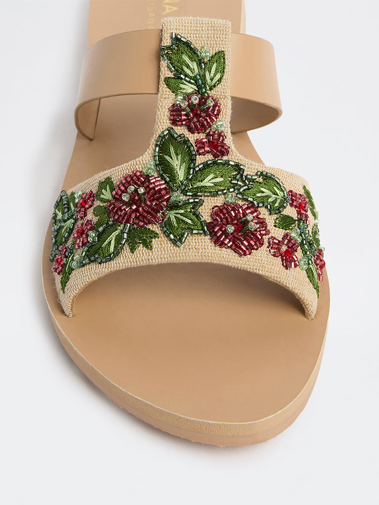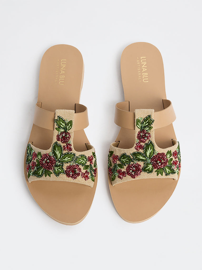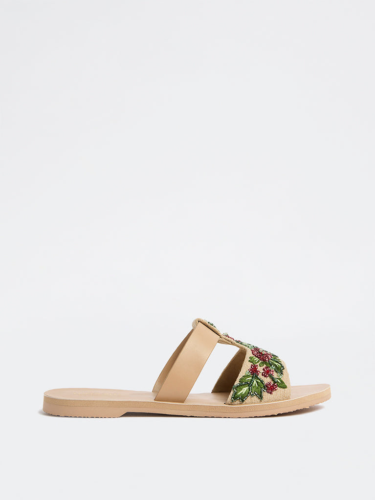 LUNA BLU presents these beige slides detailed with intricate floral embroidery for an artisanal finish. Crafted with a structured-strap design, the embellished fabric upper adds rich texture and visual depth. A smooth footbed and flat sole provide everyday comfort, while the refined construction balances decorative detailing with contemporary lines.