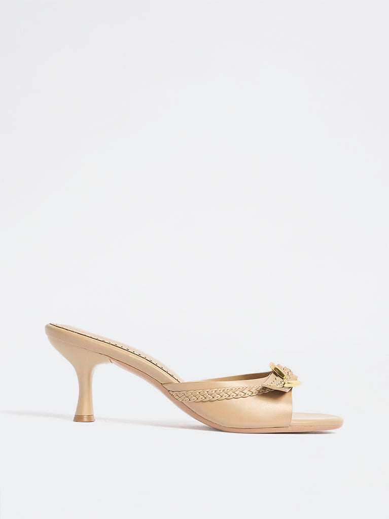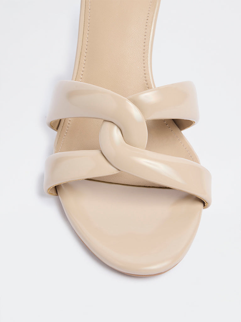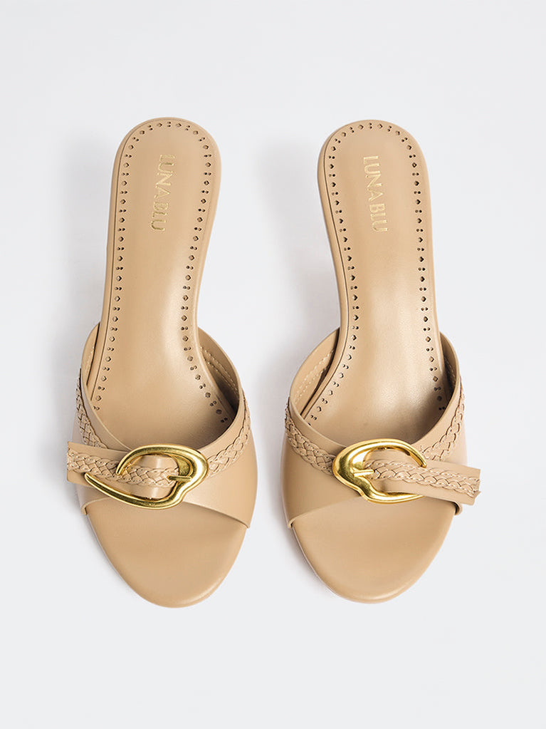 Minimal yet polished, these Luna Blu heeled beige sandals feature a smooth upper paired with a braided strap and statement metallic buckle. The open toe silhouette feels modern and effortless. A cushioned insole supports comfort, while the stable heel and durable outsole provide confident wear for day to evening styling.