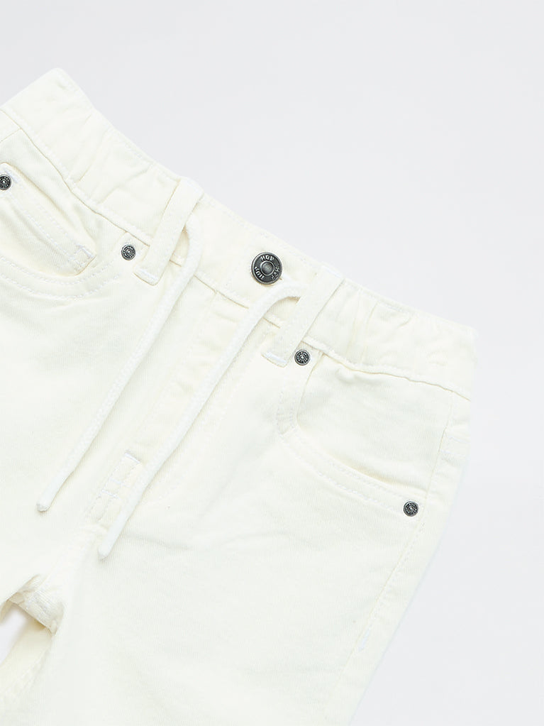 Mix comfort with cool in these off-white denim shorts from HOP Kids, styled in a clean solid profile for easy pairing. Made from a cotton-rich fabric, they feature a drawstring waistband, a button-zipper fly, belt loops, and multiple pockets—ready for playgrounds and beyond.